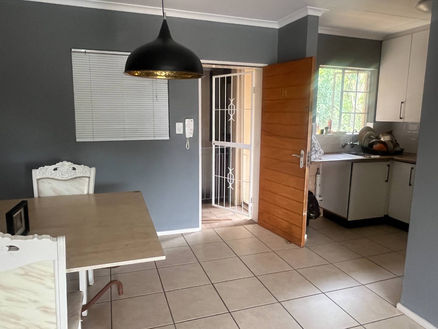 The open-plan area is spacious enough to accommodate both a lounge and a dining area. It has blinds on the window and includes a loose runner carpet that forms part of the sale. Walls are painted grey.
