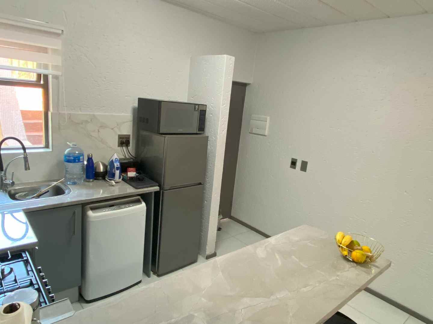 The open-plan living and dining area creates a bright, welcoming atmosphere, leading out to a private balcony perfect for morning coffee or evening relaxation. The brand-new kitchen features sleek finishes, ample cupboard space, room for a single-door fridge/freezer, and one undercounter appliance. The spacious bedroom includes built-in cupboards, while the contemporary bathroom offers both a bath and a shower for added comfort.