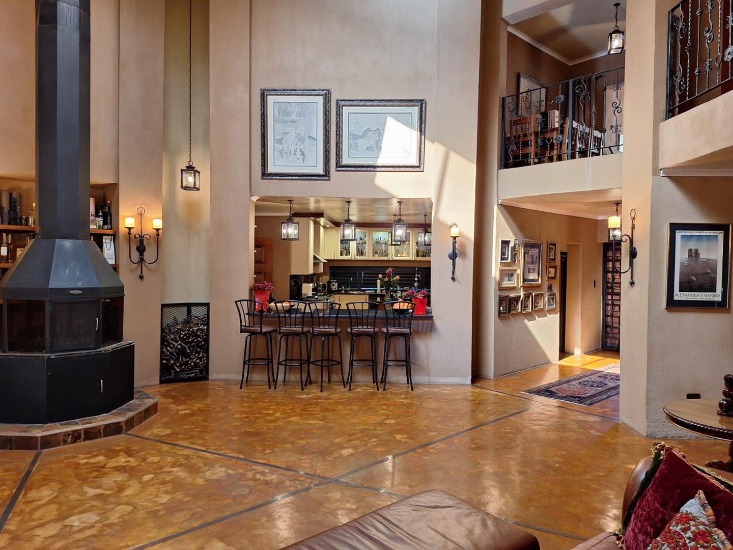 The common area lounge includes a built-in fireplace, bookshelf, conversation table, Chaise sofa and is decorated with striking artwork and ornaments. A dining room with an 8-seater wooden table, and a well-equipped kitchen with a breakfast nook, island counter and a scullery make up the rest of the common area. The full interior has screed floors and walls with warm tones.