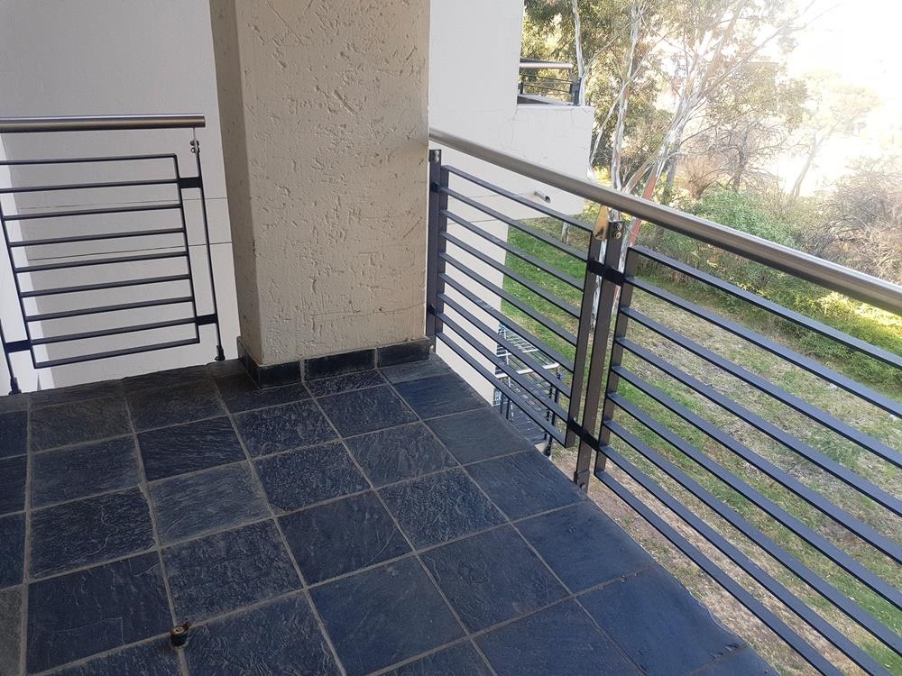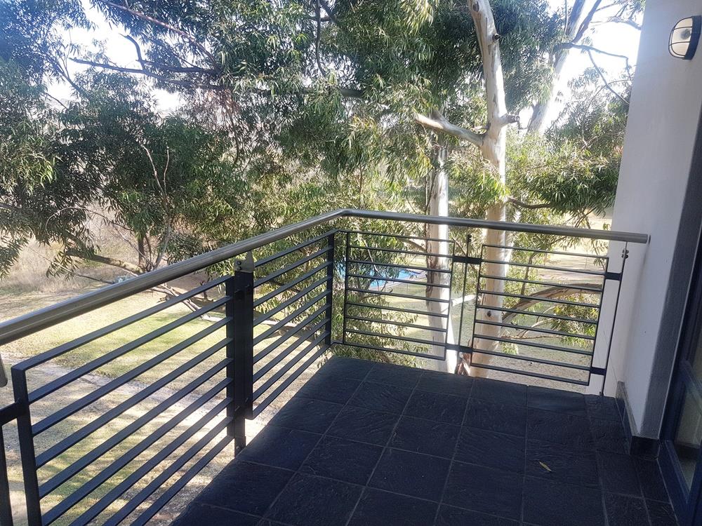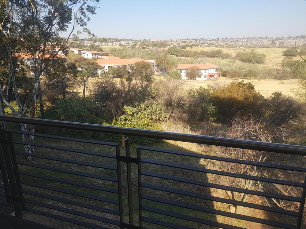 A sliding door leads from the living area onto a balcony overlooking the golf estate.