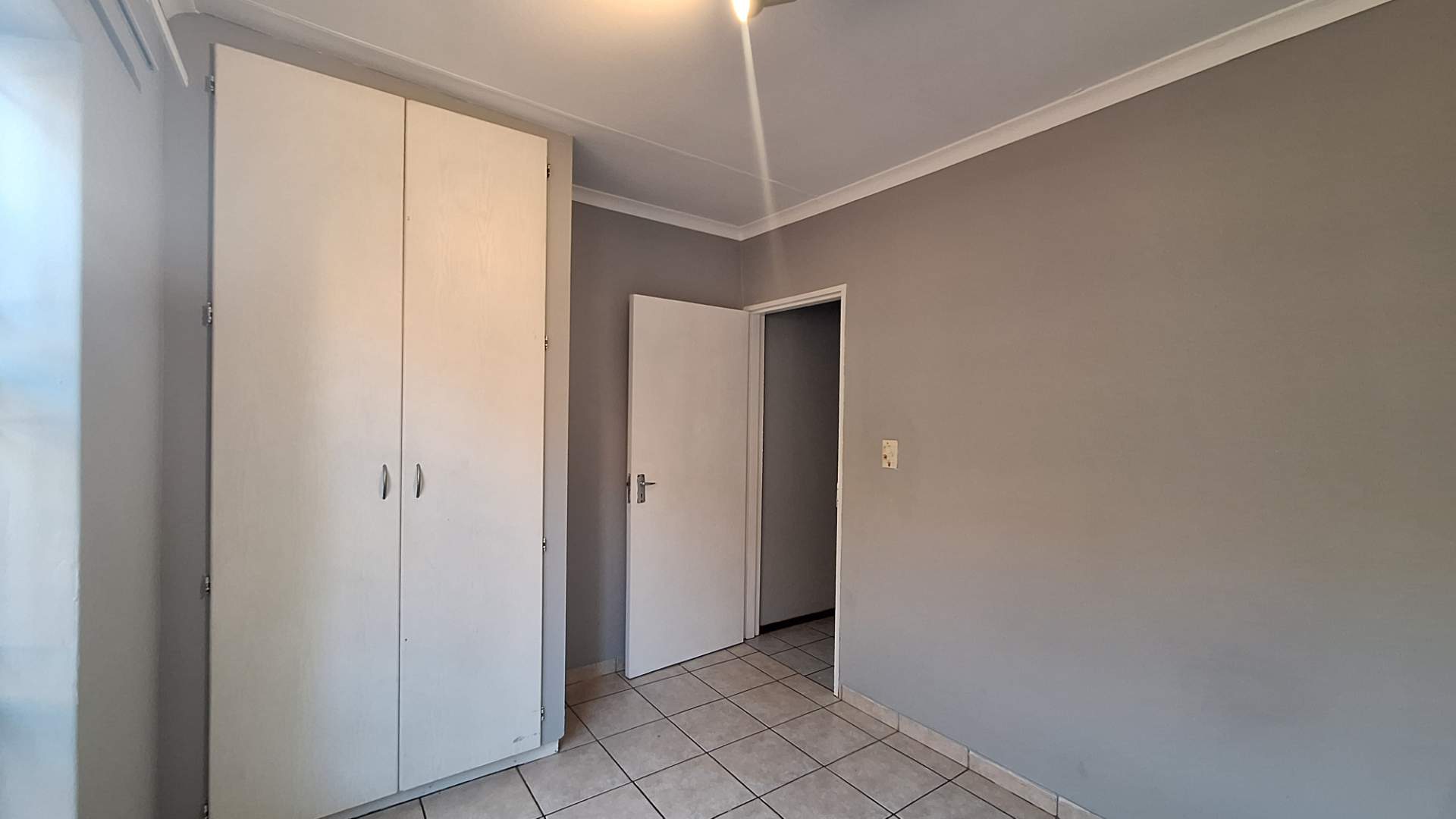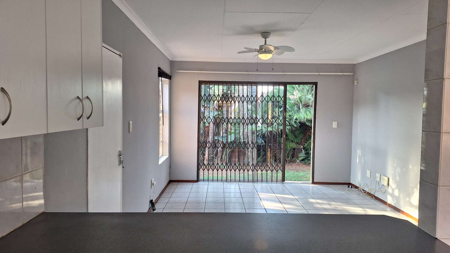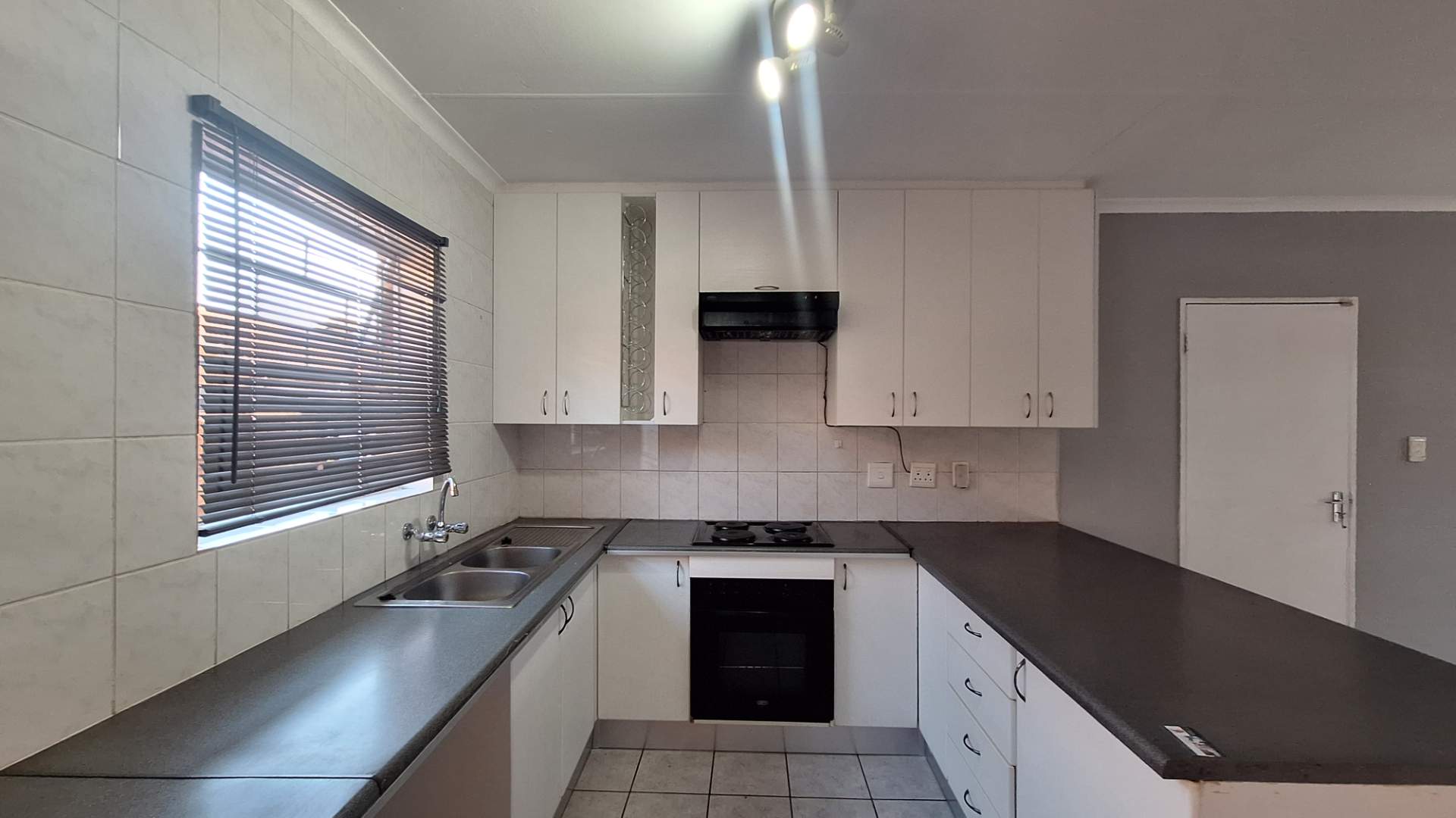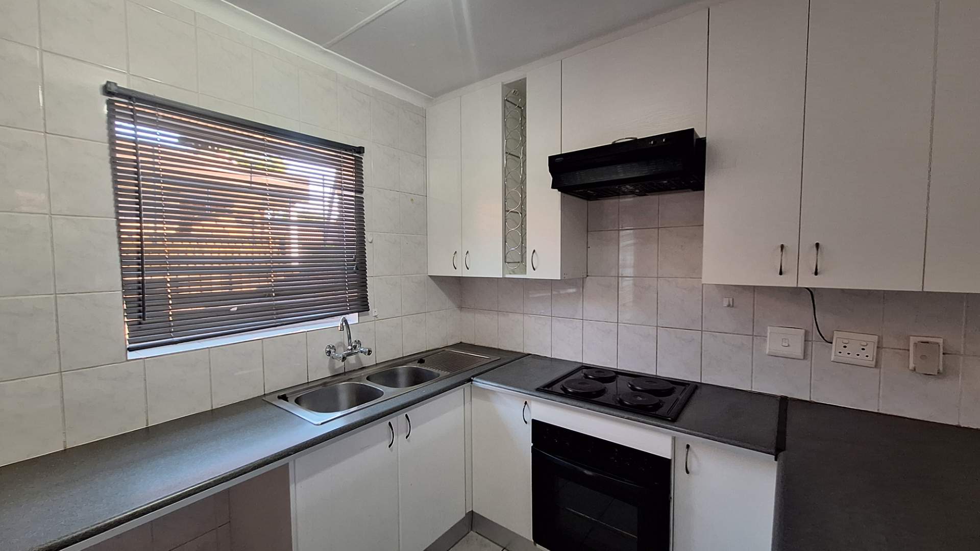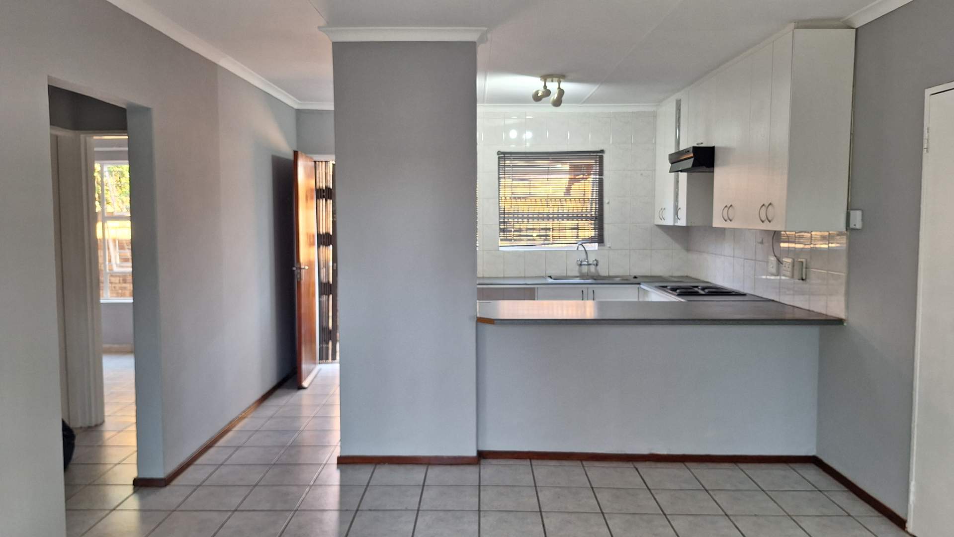 The unit is fully tiled throughout, with an open-plan kitchen and living area. The kitchen offers ample cupboard and counter space, along with a washing machine connection. Windows are fitted with burglar bars, and both the front and back doors have Trellidoors for added security.