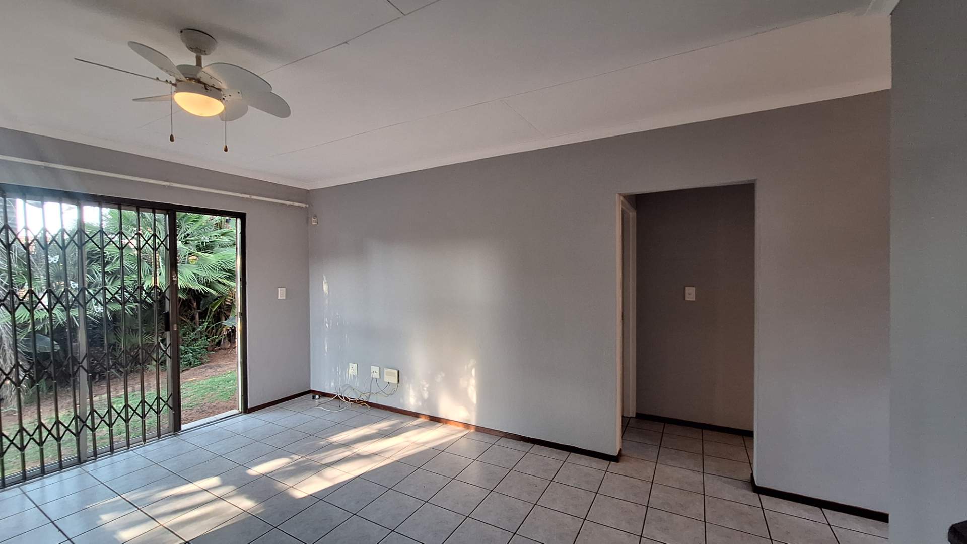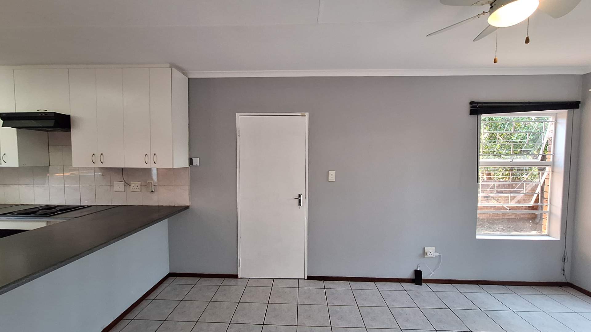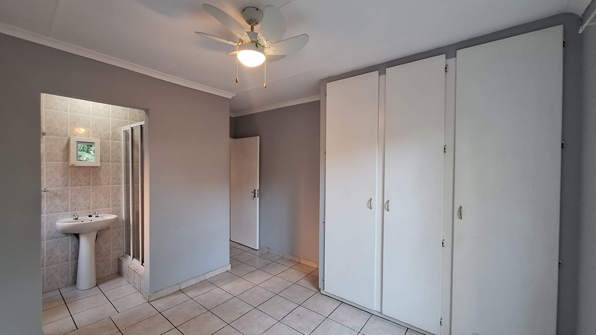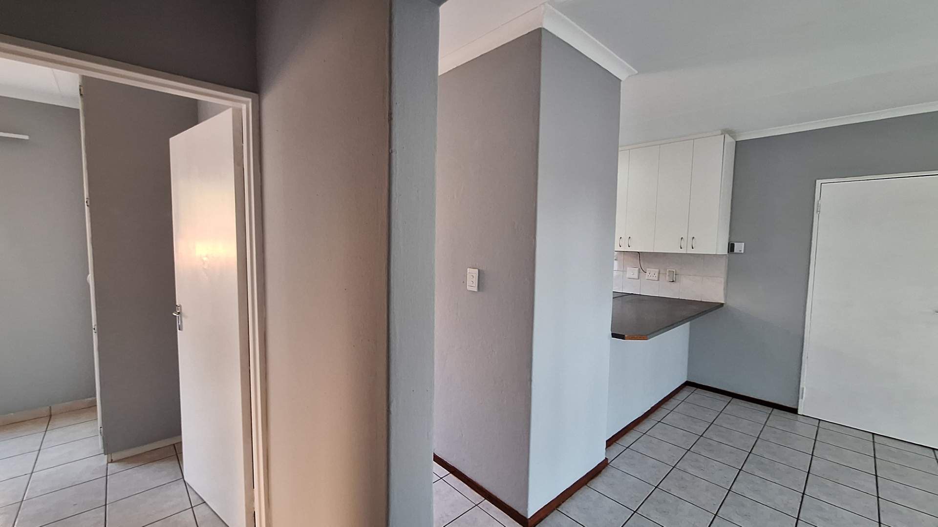 The unit is fully tiled throughout, with an open-plan kitchen and living area. The kitchen offers ample cupboard and counter space, along with a washing machine connection. Windows are fitted with burglar bars, and both the front and back doors have Trellidoors for added security.