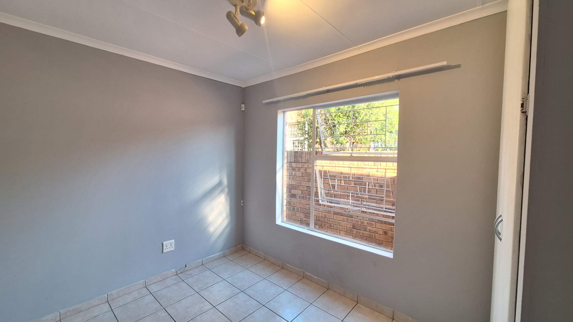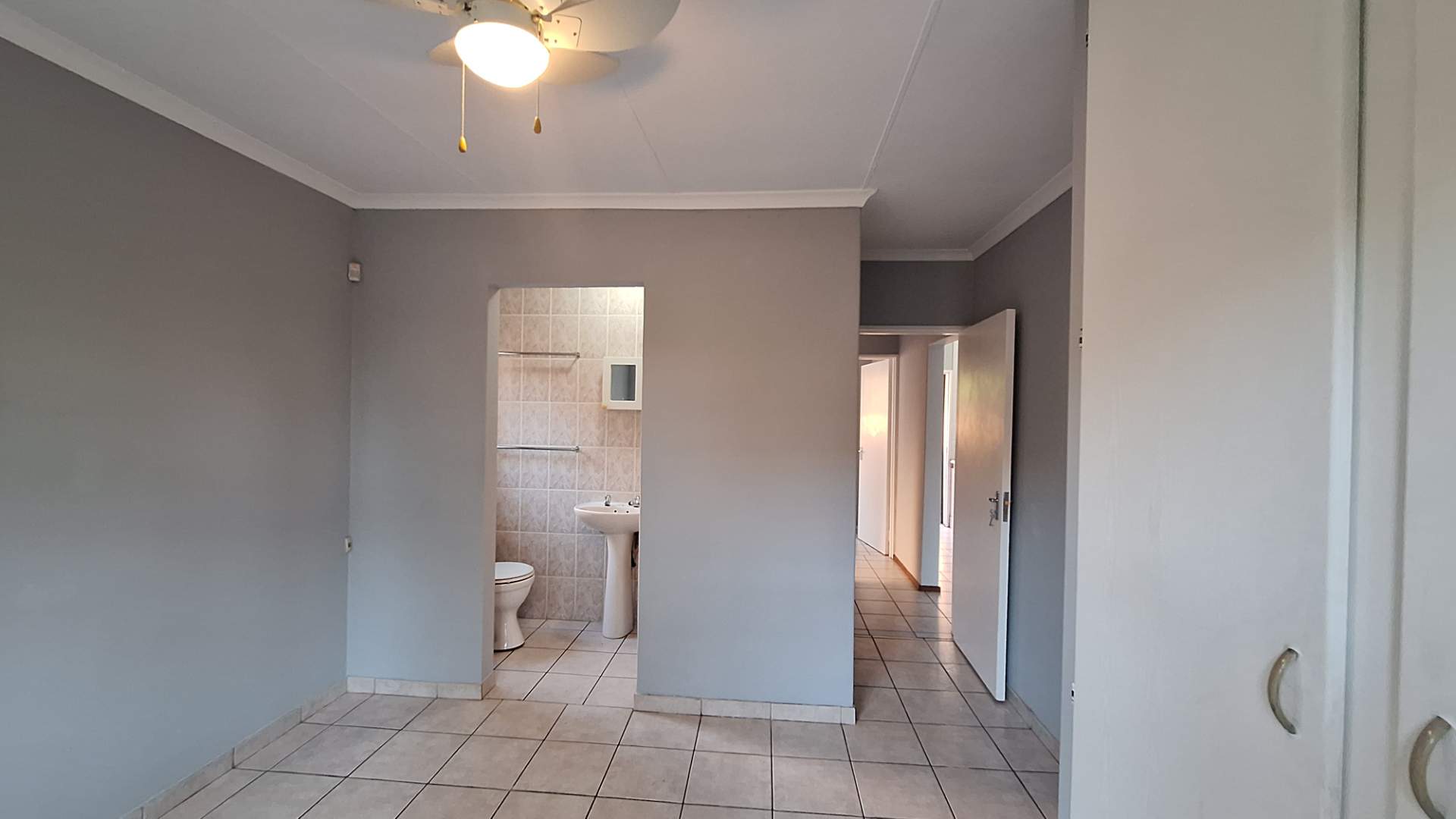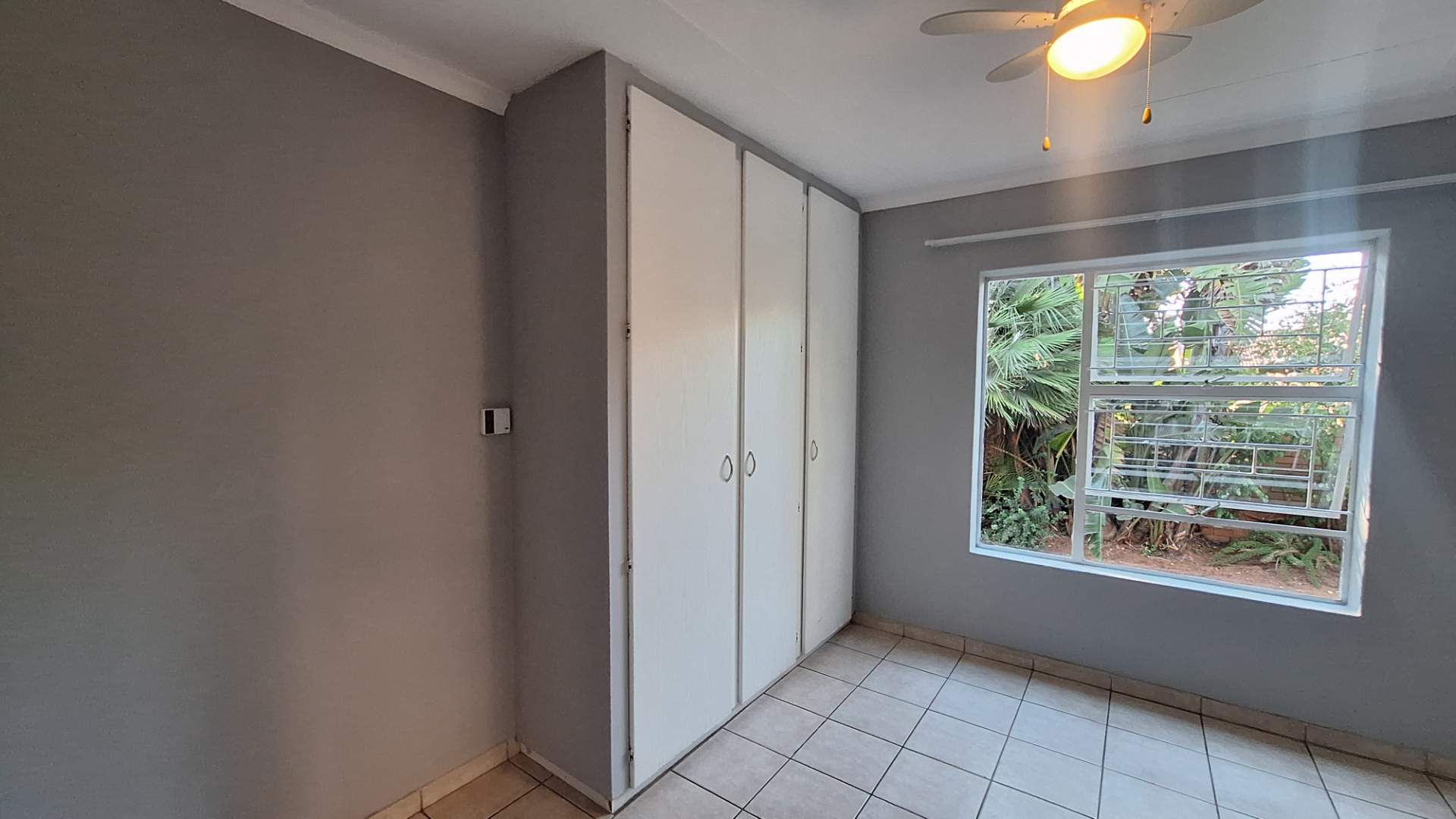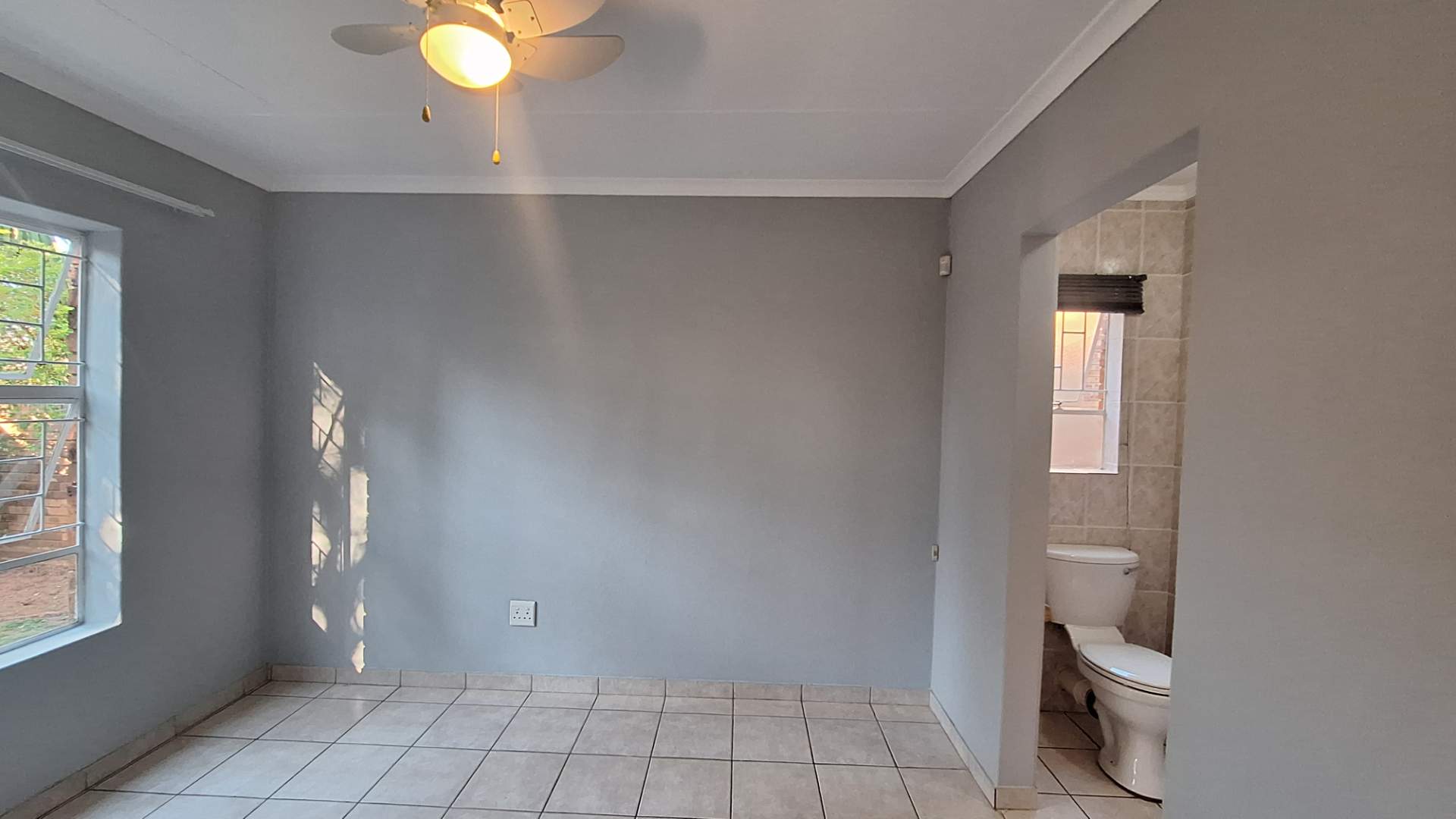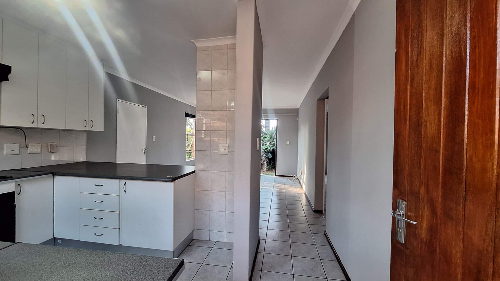 The unit is fully tiled throughout, with an open-plan kitchen and living area. The kitchen offers ample cupboard and counter space, along with a washing machine connection. Windows are fitted with burglar bars, and both the front and back doors have Trellidoors for added security.