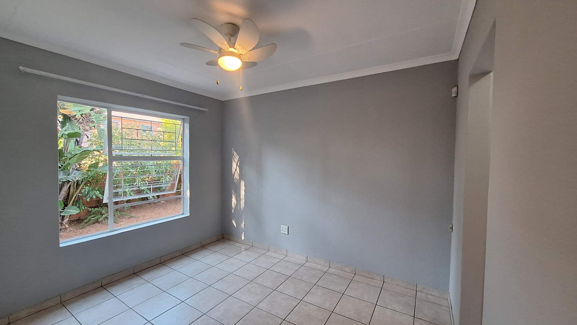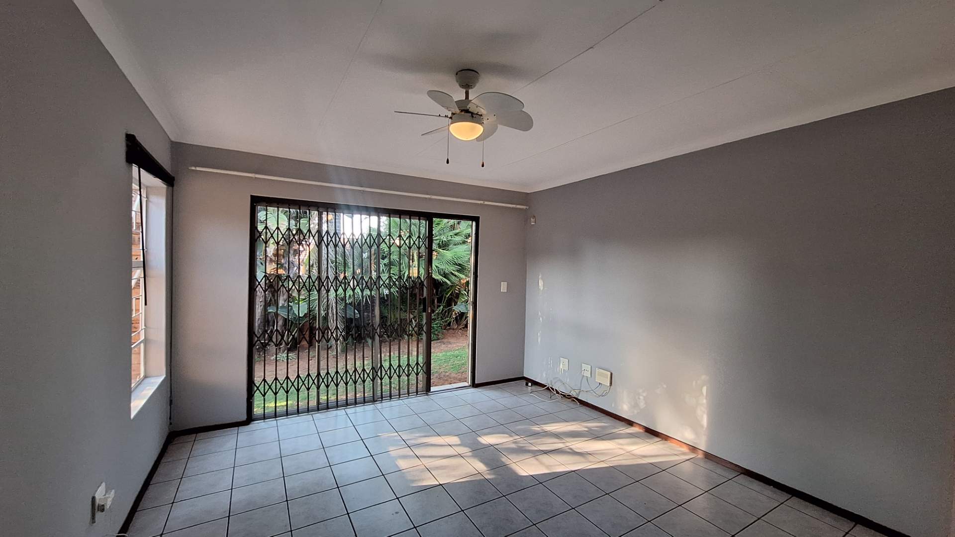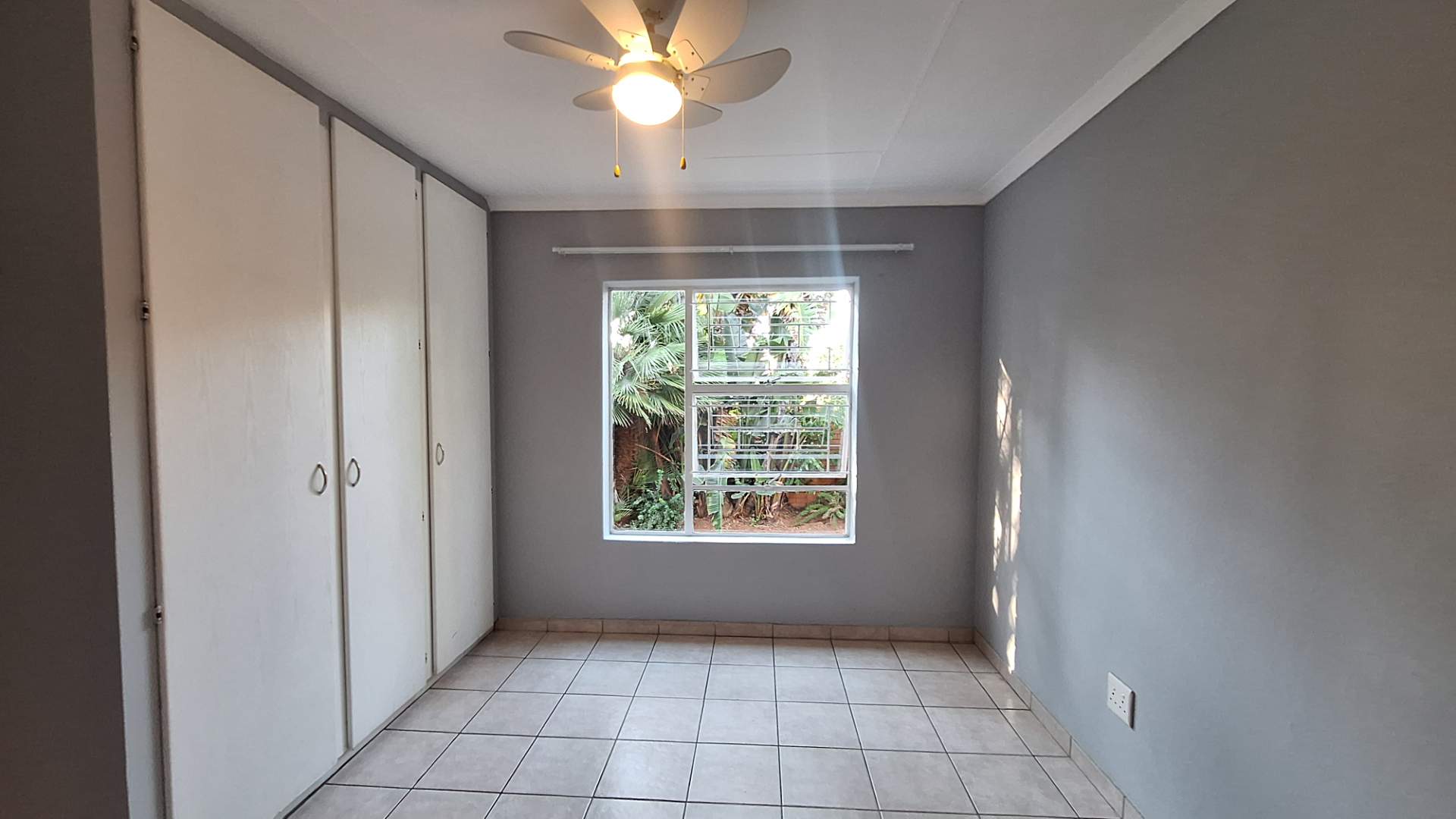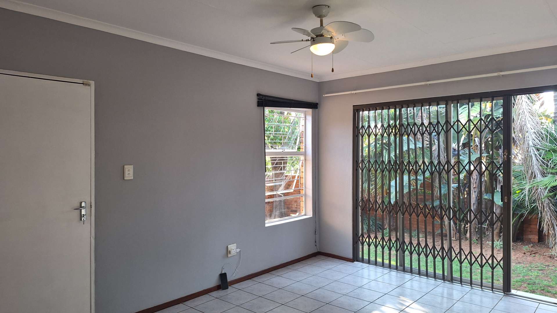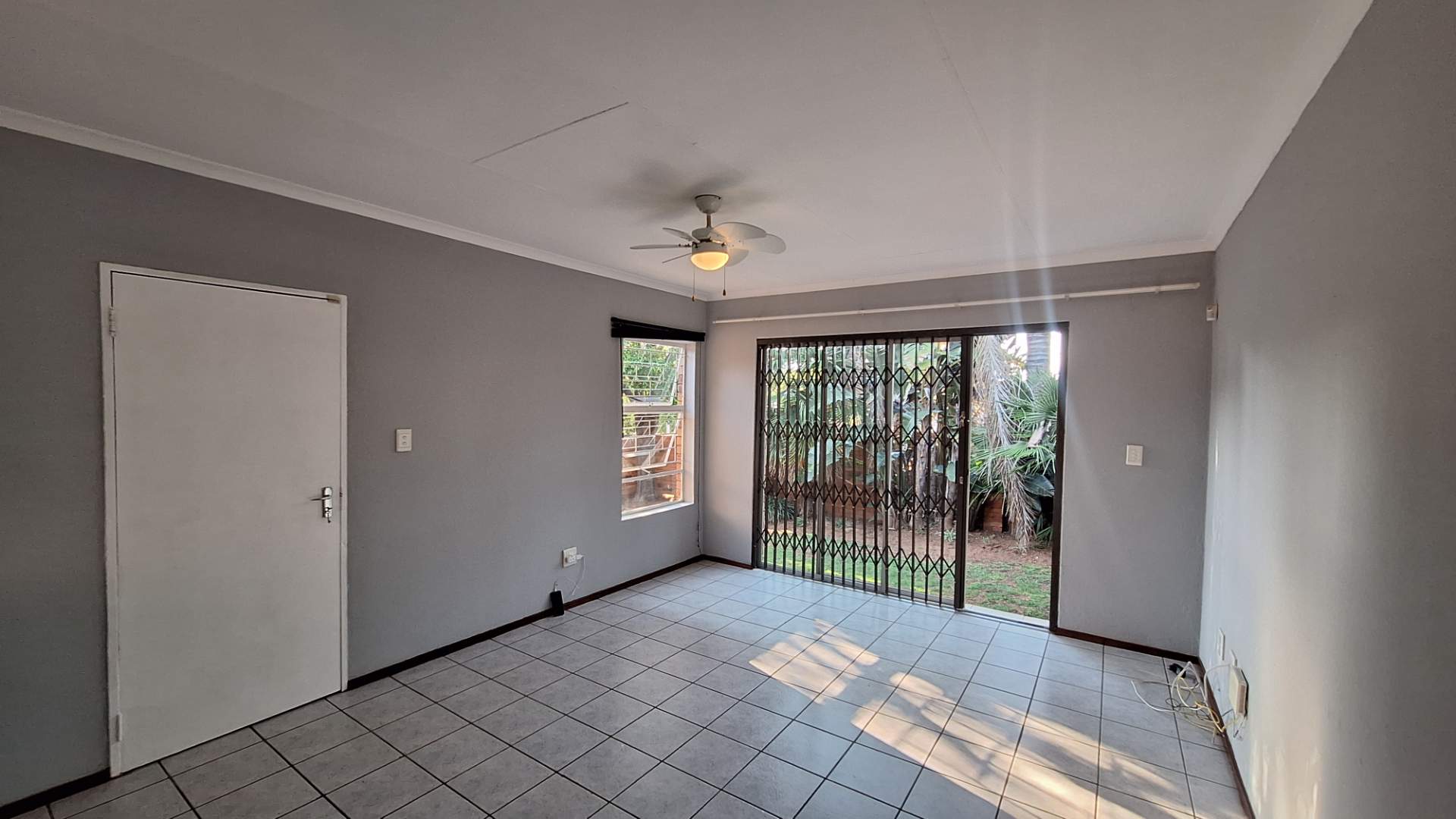 The unit is fully tiled throughout, with an open-plan kitchen and living area. The kitchen offers ample cupboard and counter space, along with a washing machine connection. Windows are fitted with burglar bars, and both the front and back doors have Trellidoors for added security.