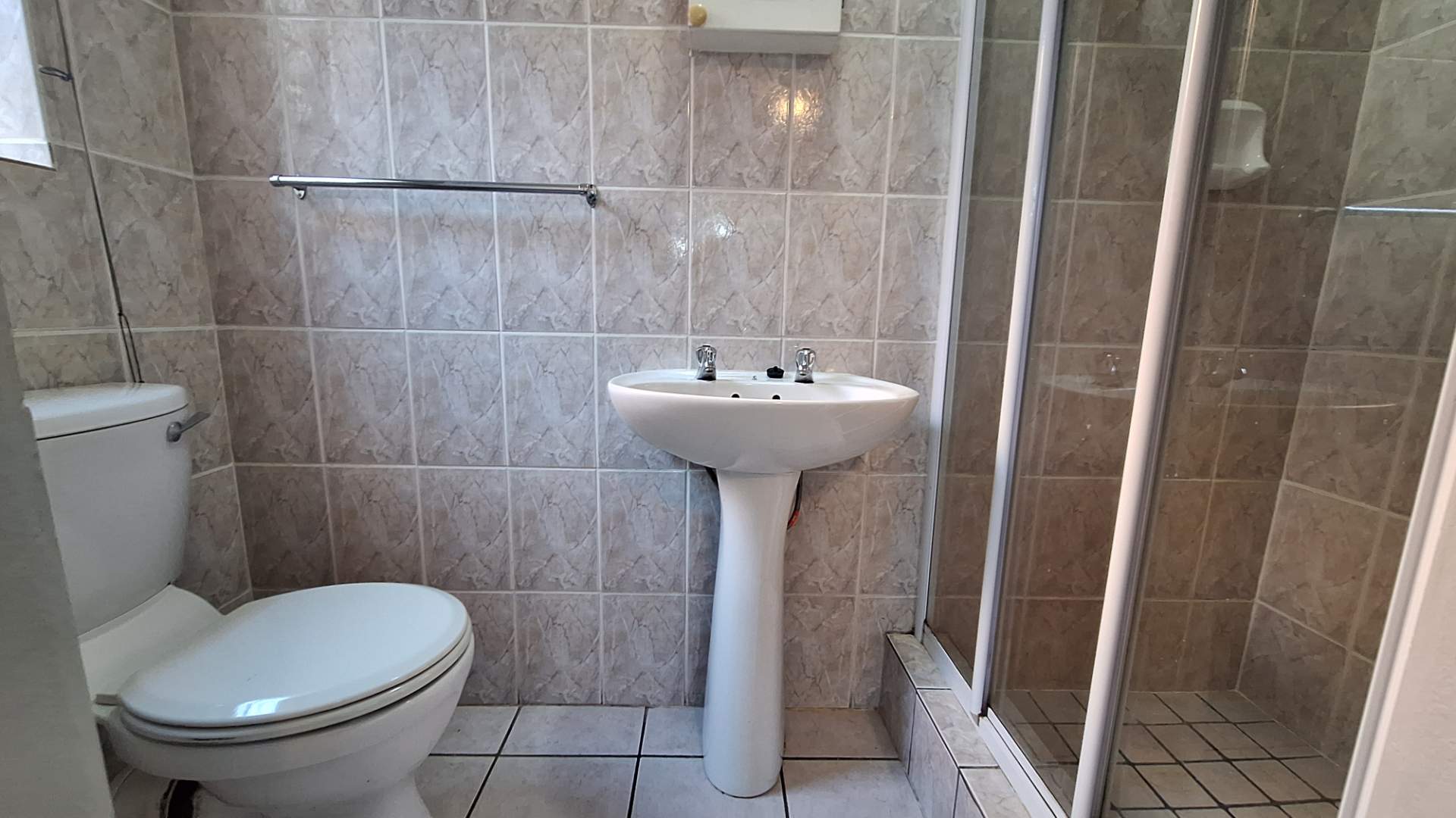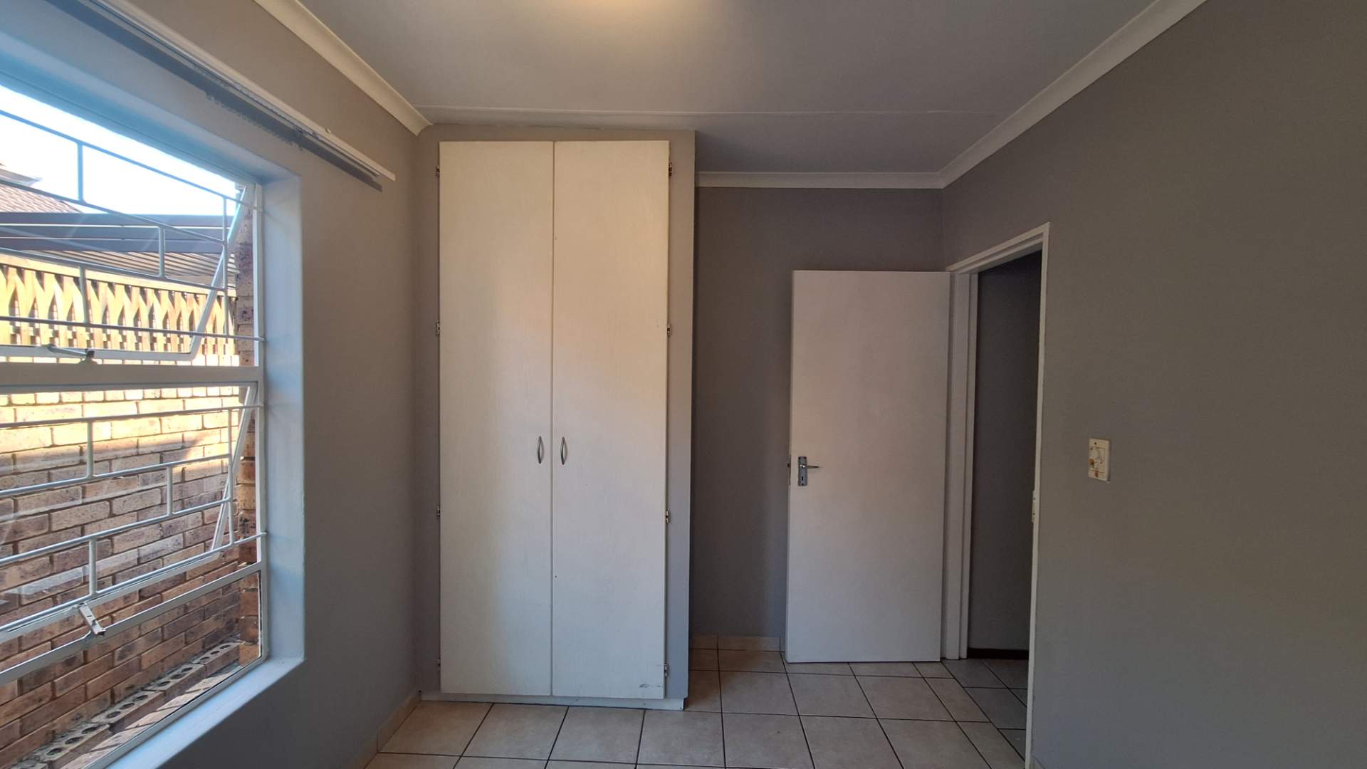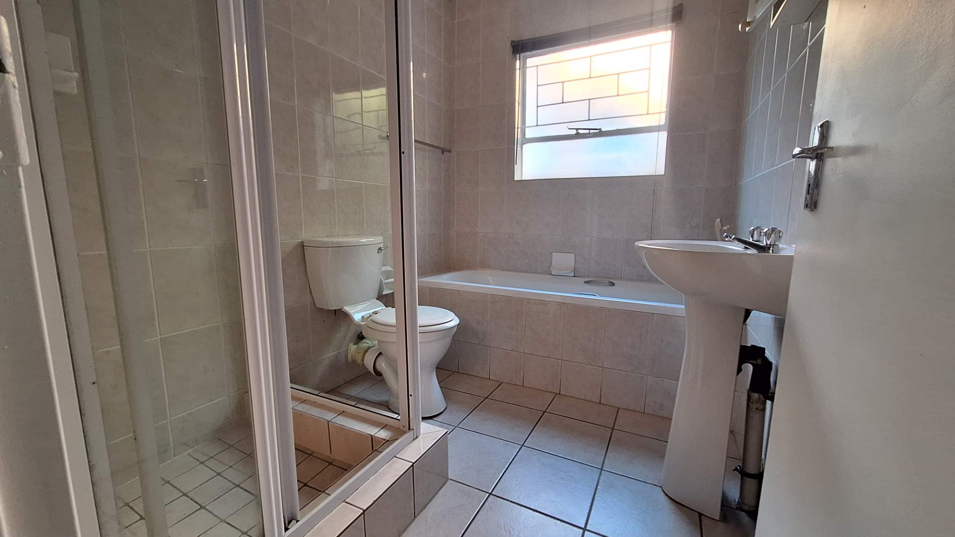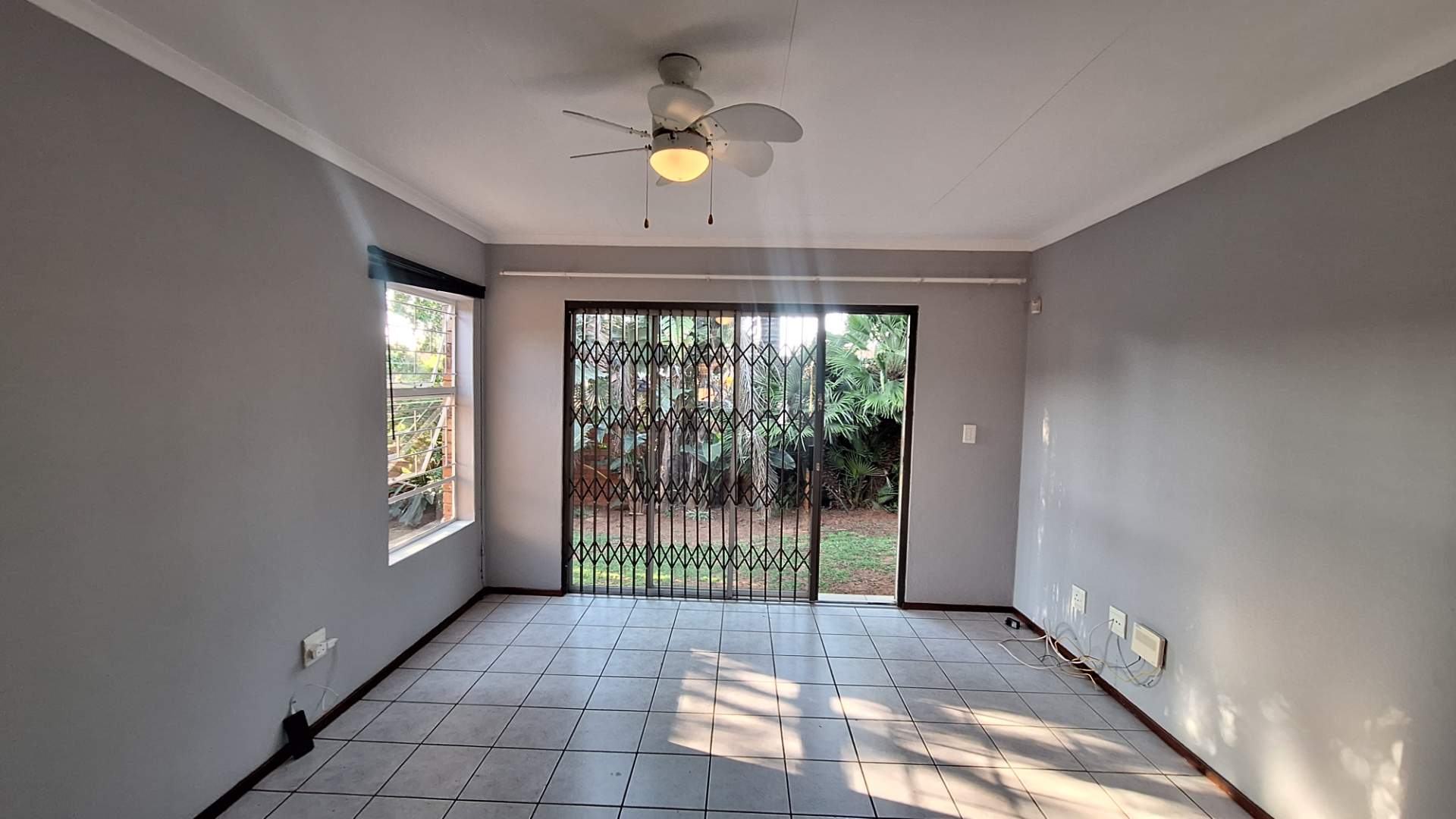 The unit is fully tiled throughout, with an open-plan kitchen and living area. The kitchen offers ample cupboard and counter space, along with a washing machine connection. Windows are fitted with burglar bars, and both the front and back doors have Trellidoors for added security.