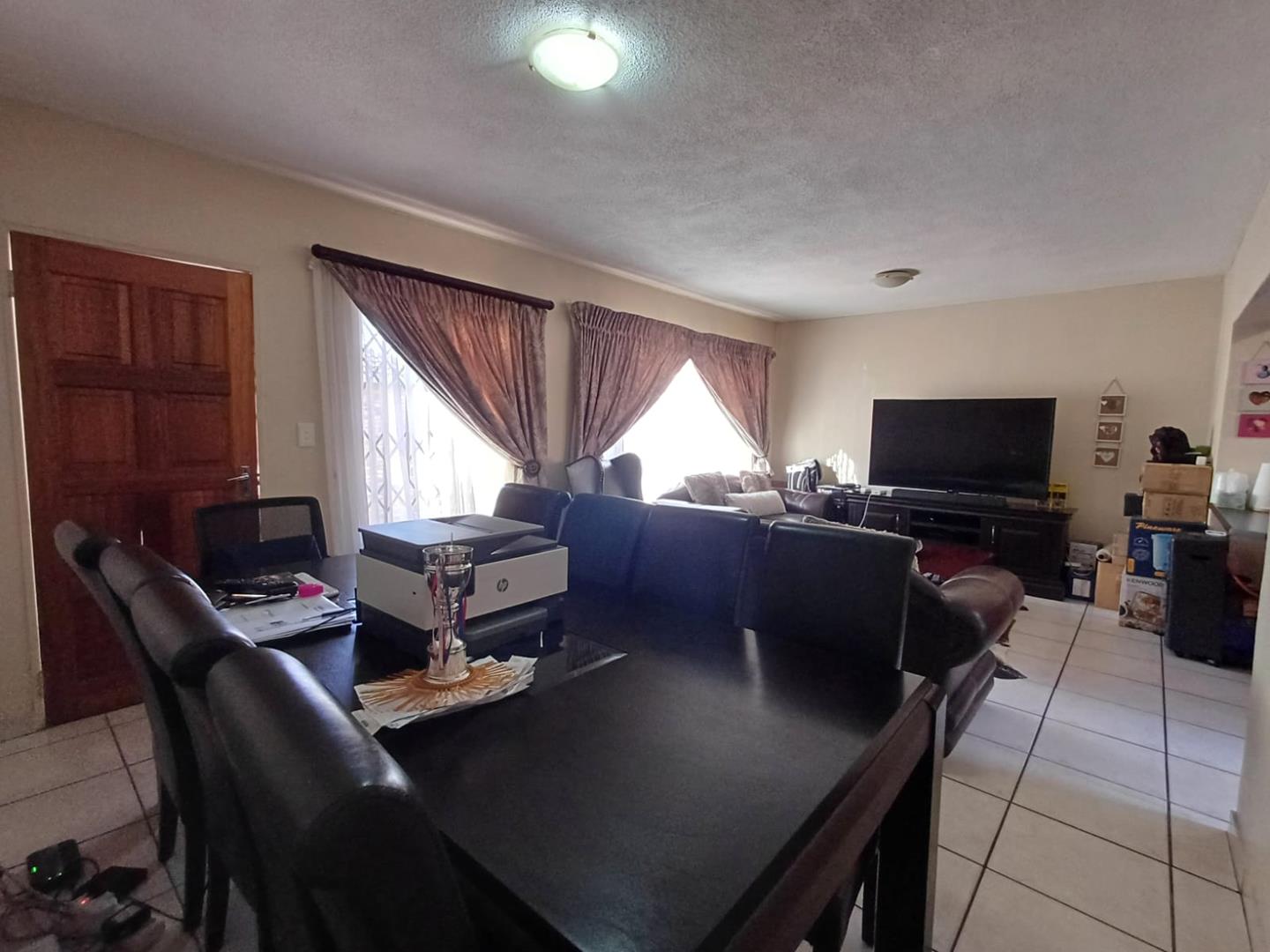 The lounge is bright and inviting, with double windows and a door leading out to the pet-friendly, enclosed garden. Additional security is provided by a Trellidor and a tiled floor, along with a front door secured by a security gate. Large double sliding doors open onto the patio and garden, creating a seamless indoor-outdoor flow ideal for entertaining. The double garage offers direct access to the house, adding to the convenience and security of the home.