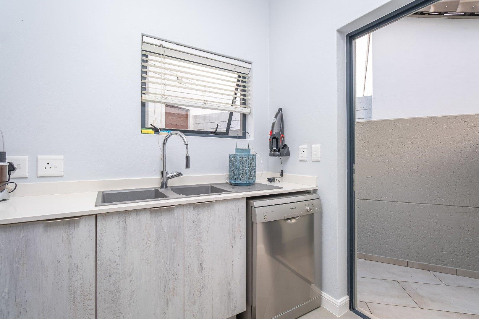 Access through glass aluminium door to the back yard for garage, dustbins & wash line area