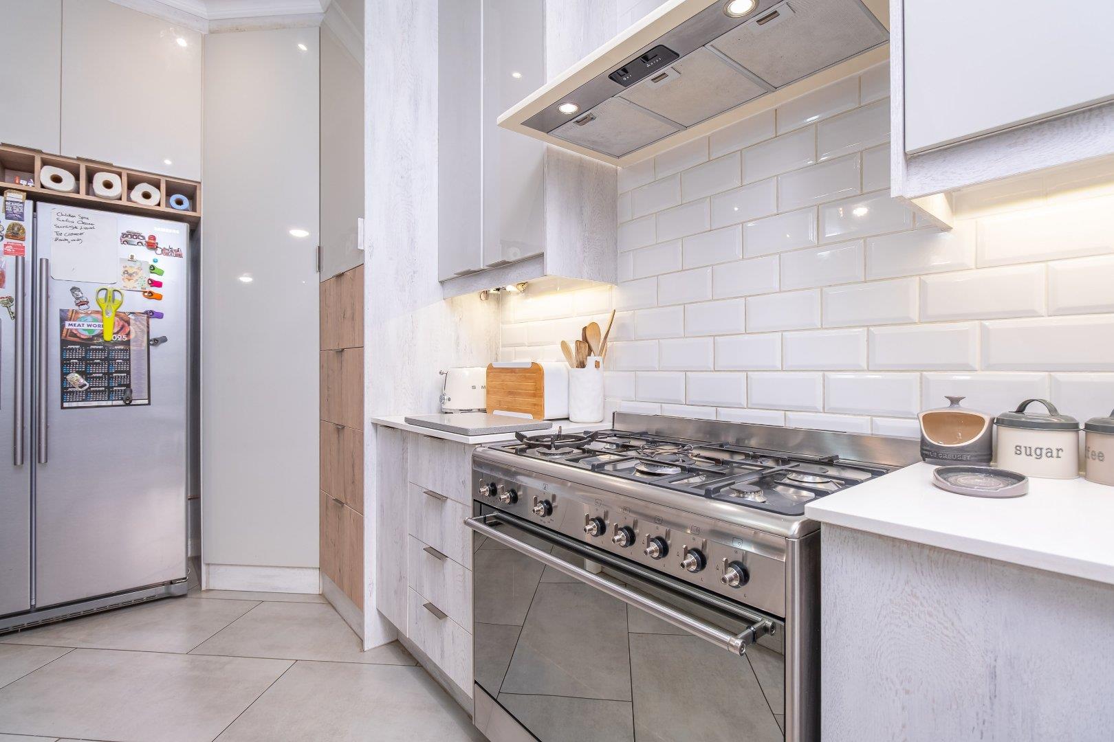 With separate scullery, space for 2 wet appliances, broom cupboard & wash up. The tops finished in Caesar Stone, with Gas 5x Burner stove and under counter Miele oven & dziner extractor fan.