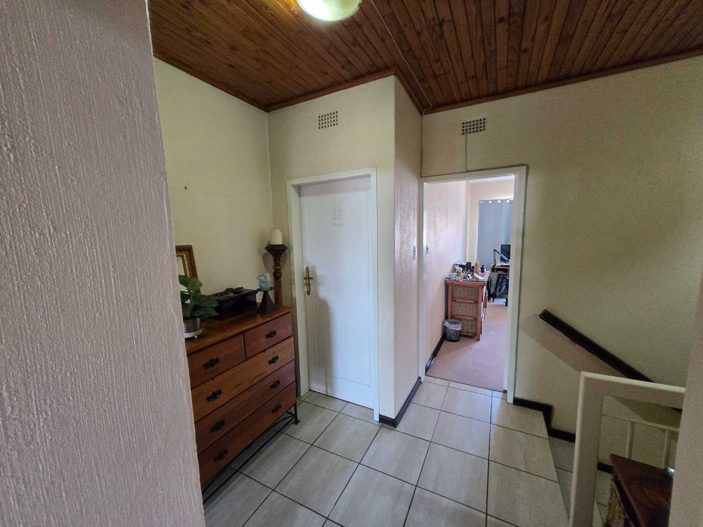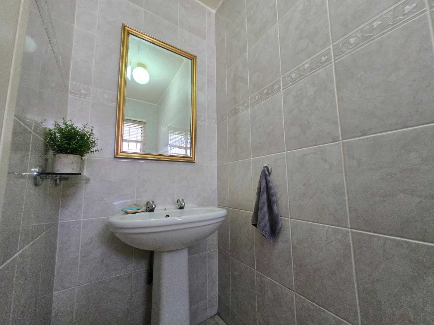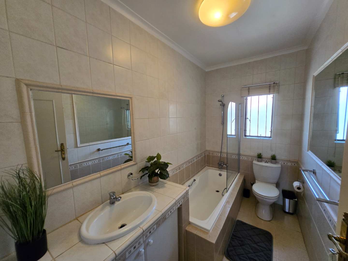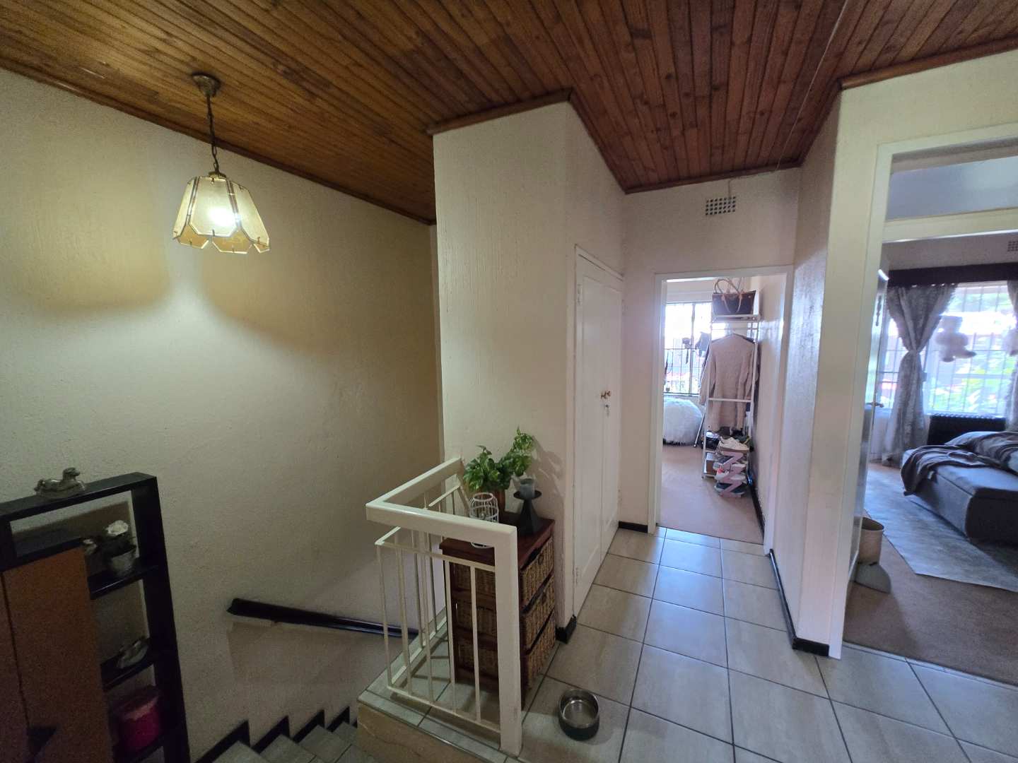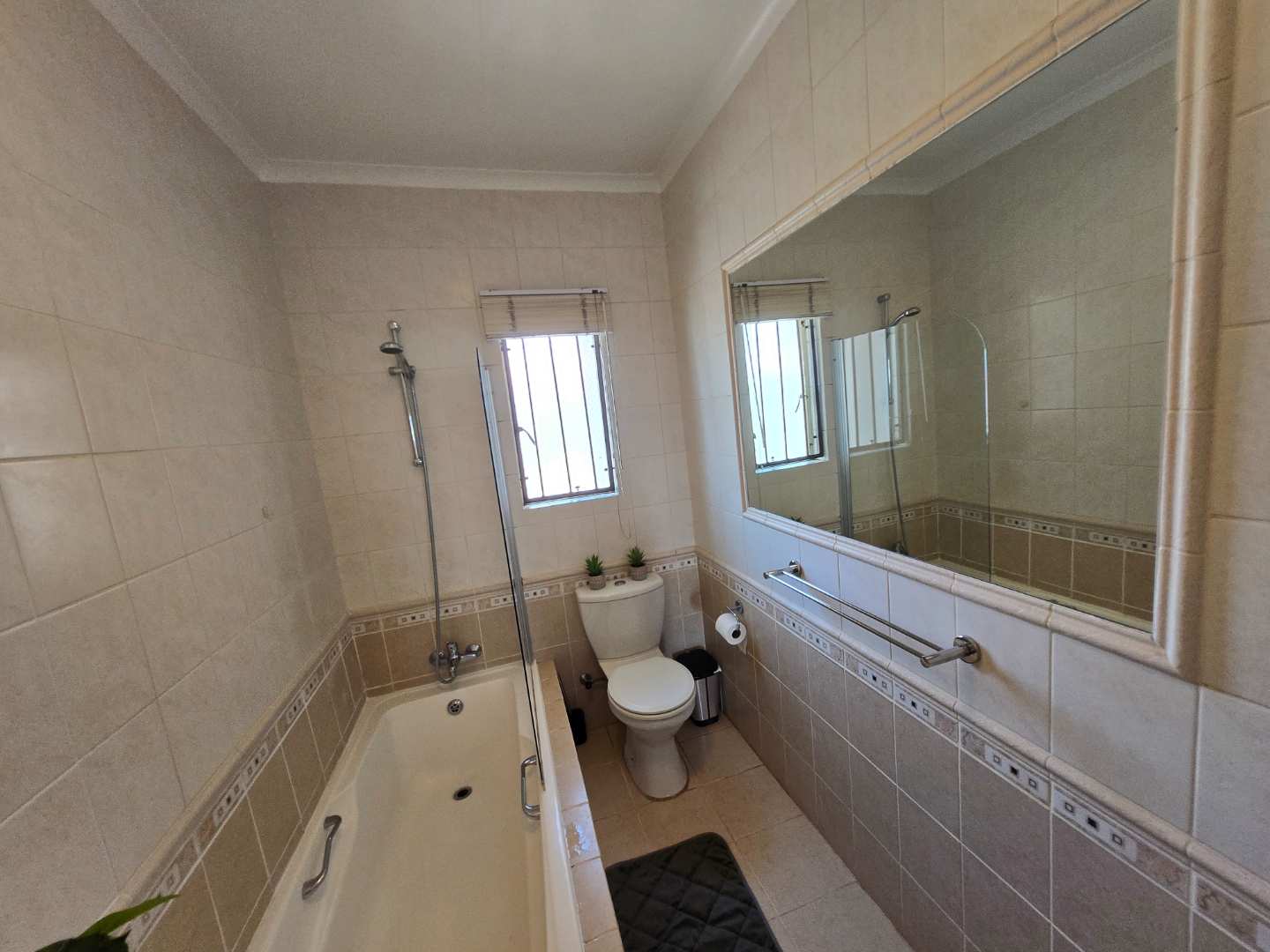 Upstairs, you’ll find extra cupboard space on the landing, along with two well-sized bedrooms featuring built-in wardrobes. Both rooms can comfortably accommodate queen-size beds and share a full bathroom with a bath-shower combo, toilet, and basin.