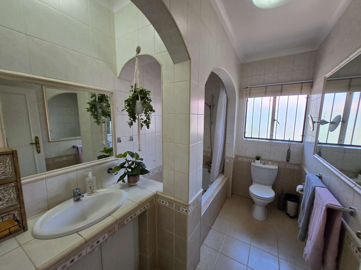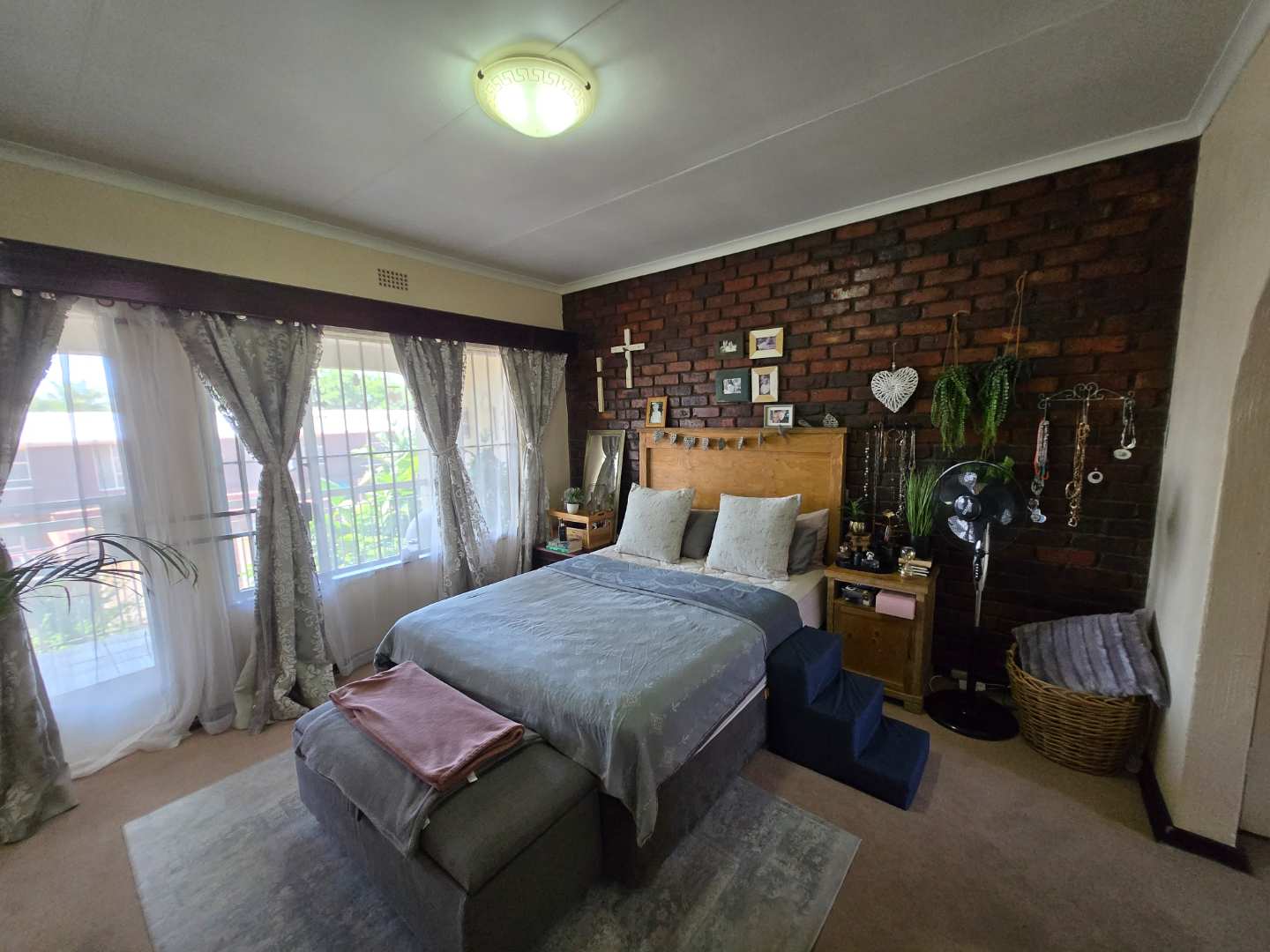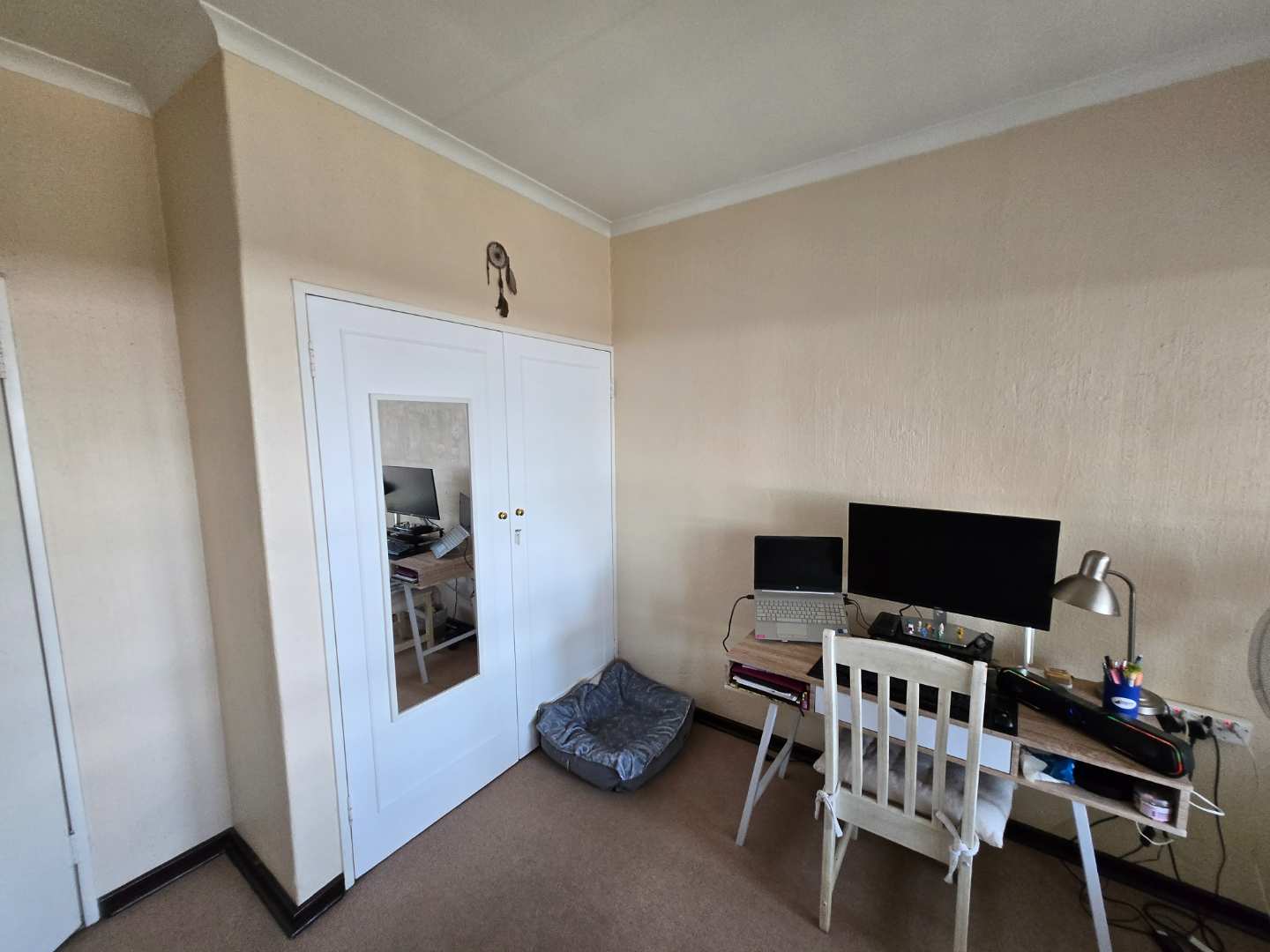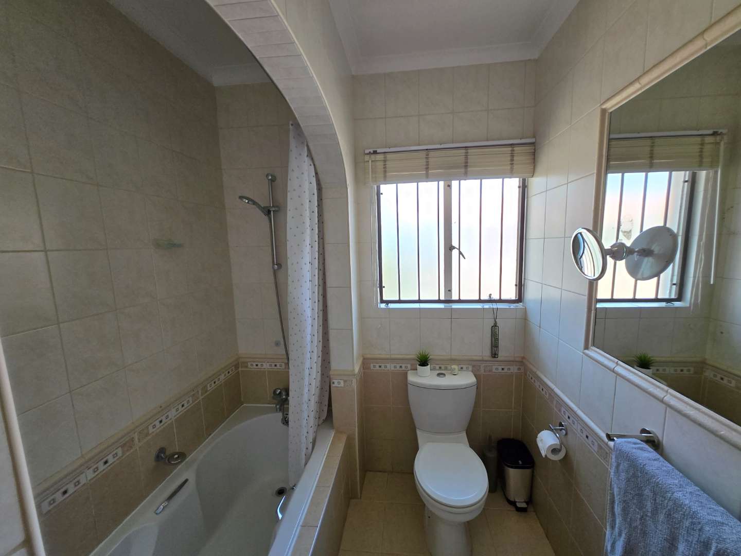 Upstairs, you’ll find extra cupboard space on the landing, along with two well-sized bedrooms featuring built-in wardrobes. Both rooms can comfortably accommodate queen-size beds and share a full bathroom with a bath-shower combo, toilet, and basin.
