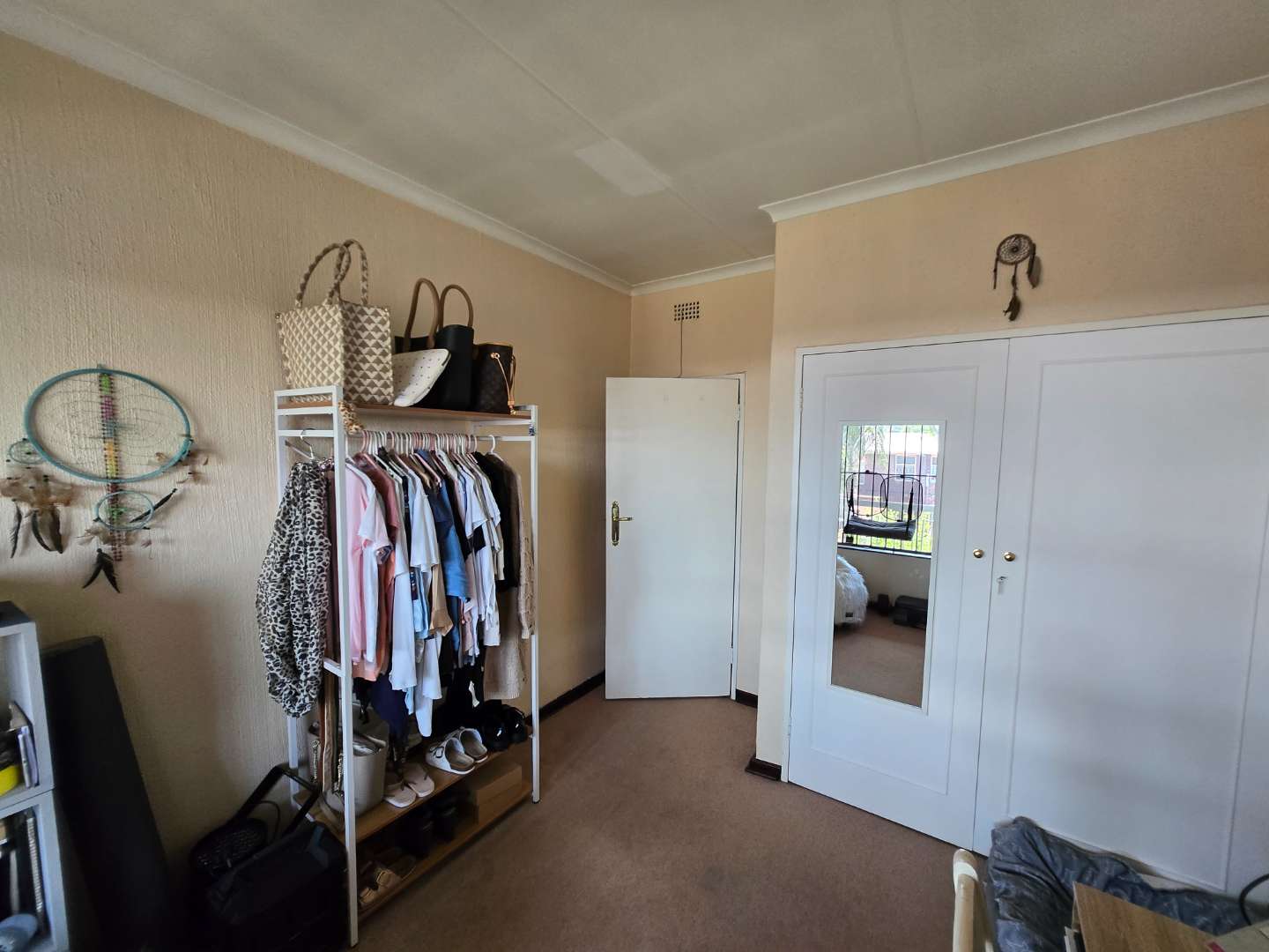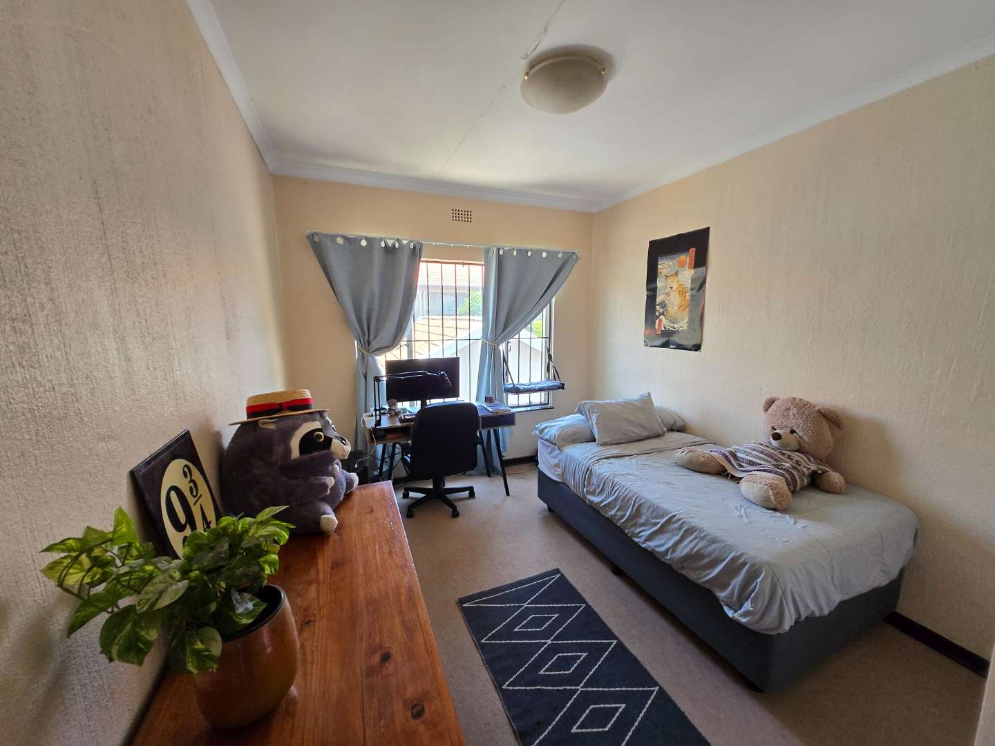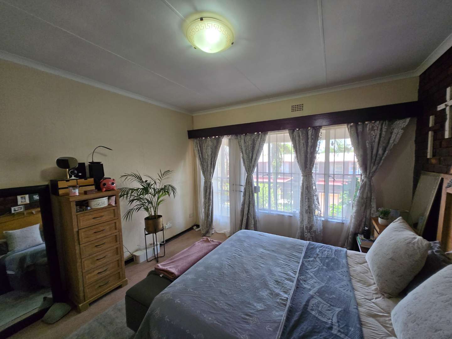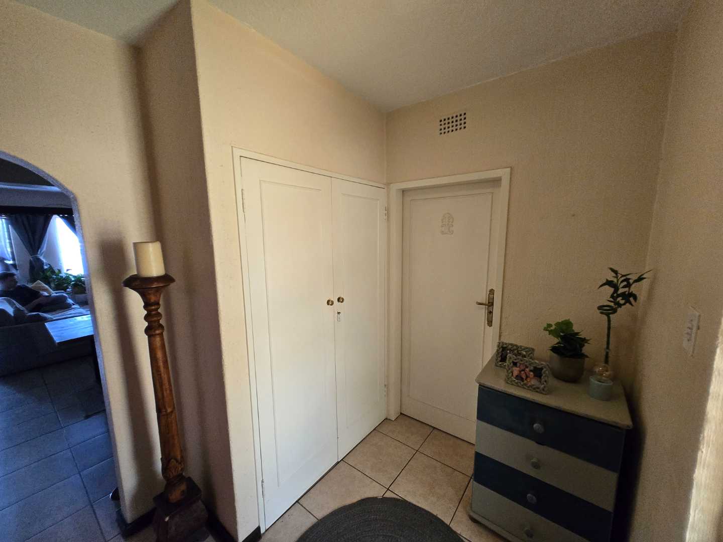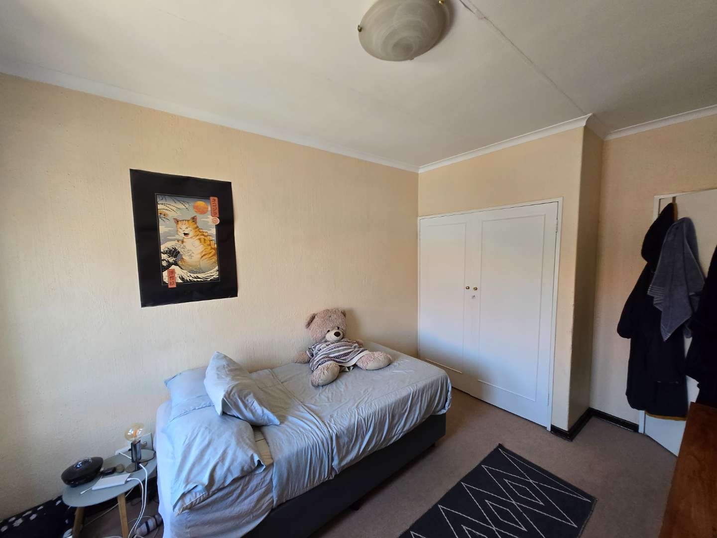 Upstairs, you’ll find extra cupboard space on the landing, along with two well-sized bedrooms featuring built-in wardrobes. Both rooms can comfortably accommodate queen-size beds and share a full bathroom with a bath-shower combo, toilet, and basin.