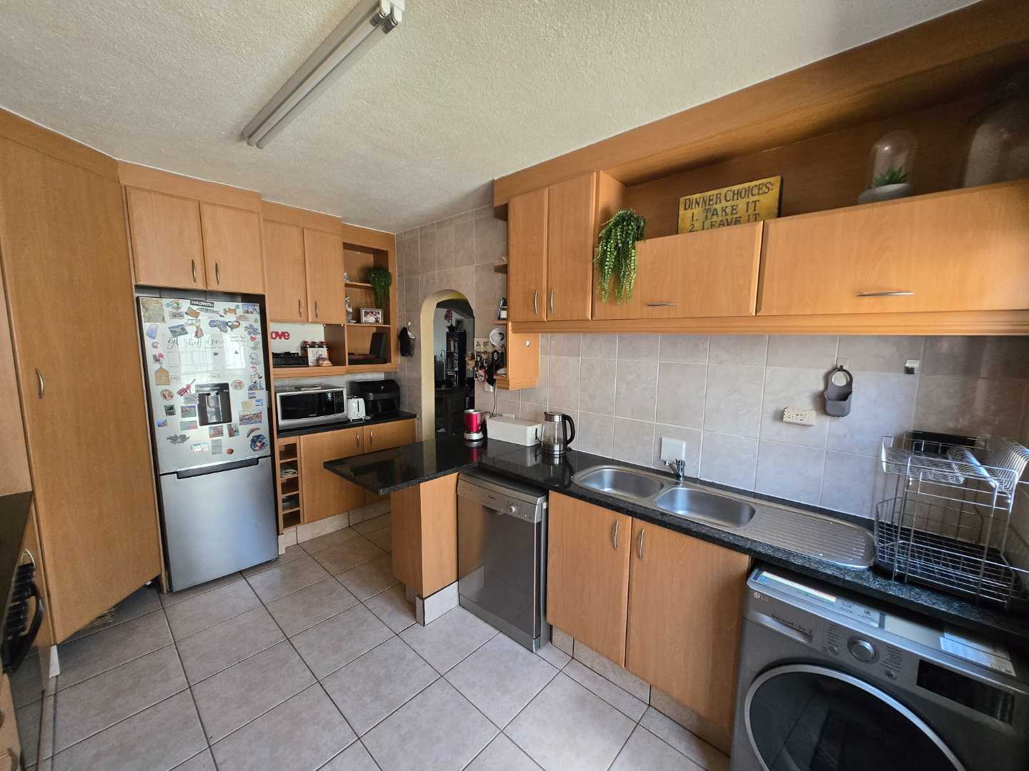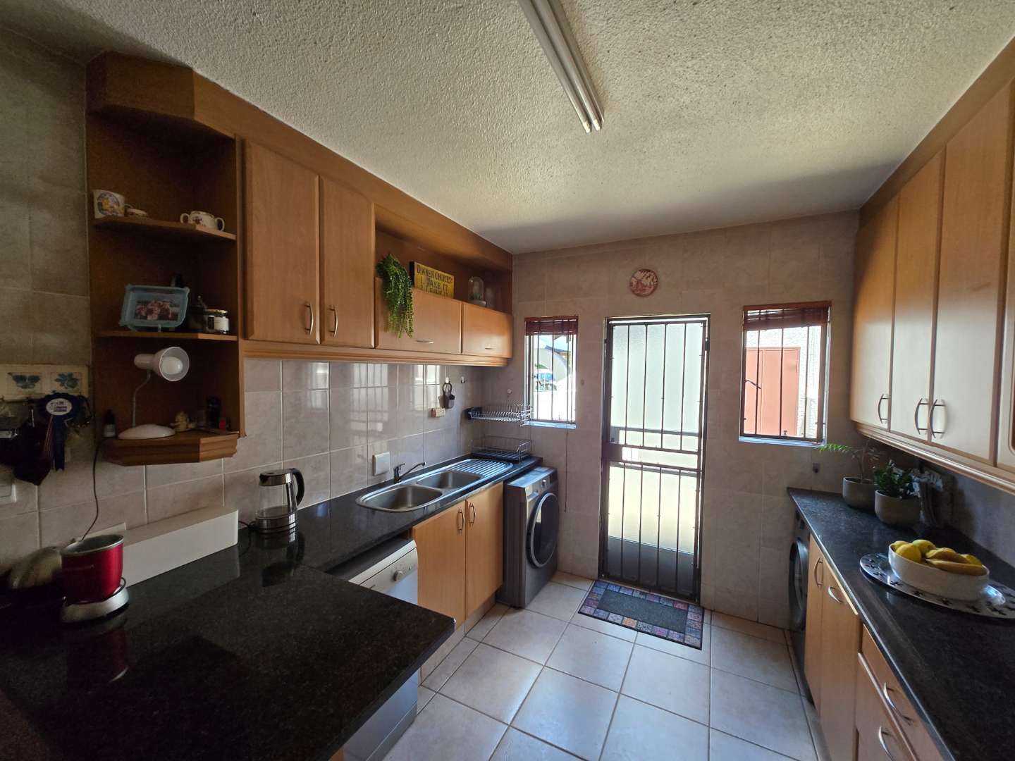 As you enter, you’re welcomed by a neat little foyer with built-in cupboards and a convenient guest toilet. The modern kitchen, just off the entrance, offers space for two under-counter appliances and a single-door fridge. It also provides direct access to a private wash line area and the back entrance to the single automated garage. The unit includes one automated garage and a designated carport.