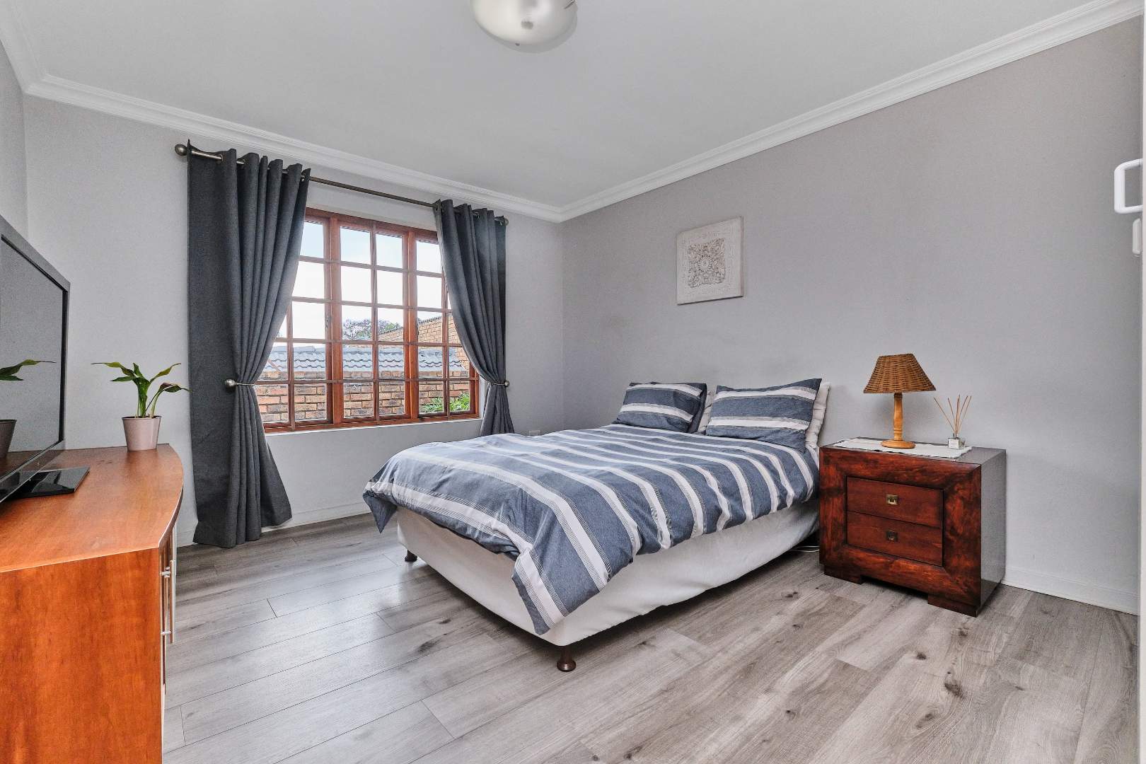 There is a dedicated wash-up area; space for 2 wet appliances & corner grocery cupboards. The counter tops finished in white Caesar stone add class & style, with 4x gas plate burner and under counter oven with stainless-steel extractor fan. Access through a wood & glass door to the back enclosed courtyard lead to double garage, dustbins & wash line area.
