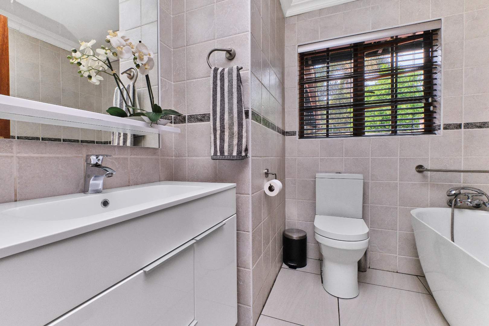 Two of the bedrooms are serviced by a stylish bathroom, which features a trendy built-in vanity cabinet, shower, a luxurious stone freestanding bath, a basin, and a toilet