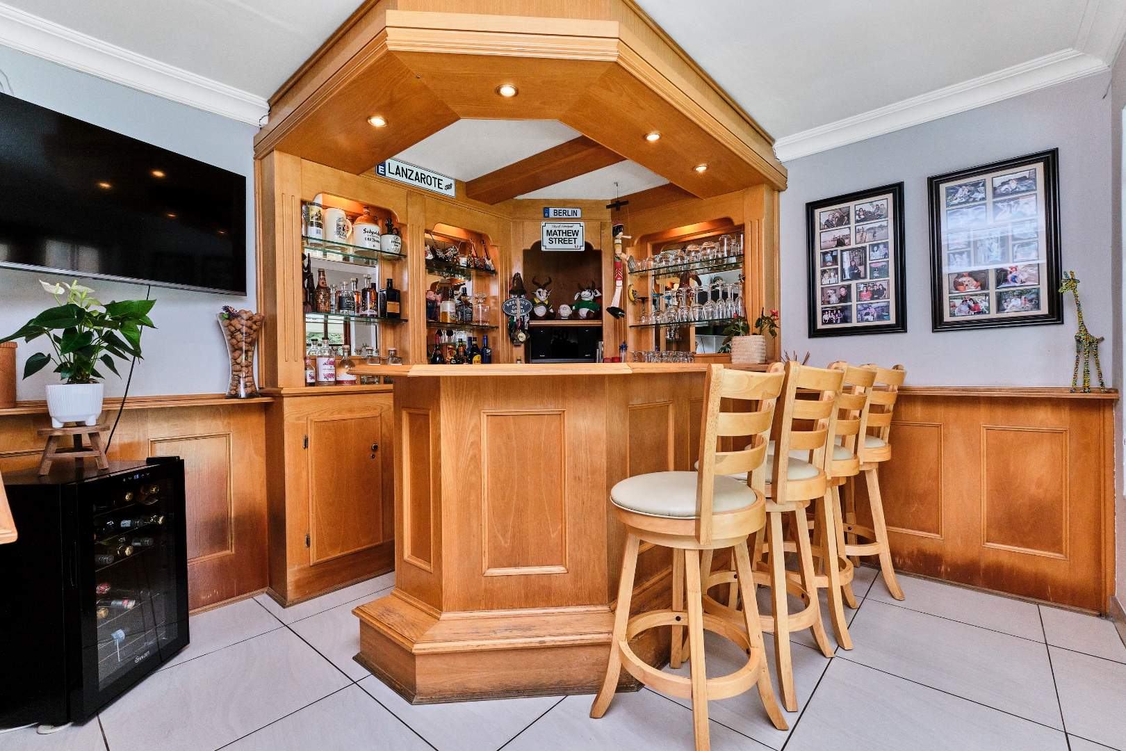 Enter through the welcoming front door into a spacious hallway that can double as a lounge. On the right is a large dining area flowing into an open-plan kitchen; to the left, a bright TV room connects to a custom-installed pub. The pub opens to a covered patio overlooking the pool, entertainment area, and landscaped gardens. Stylish lighting and tiling enhance the home's distinctive look.