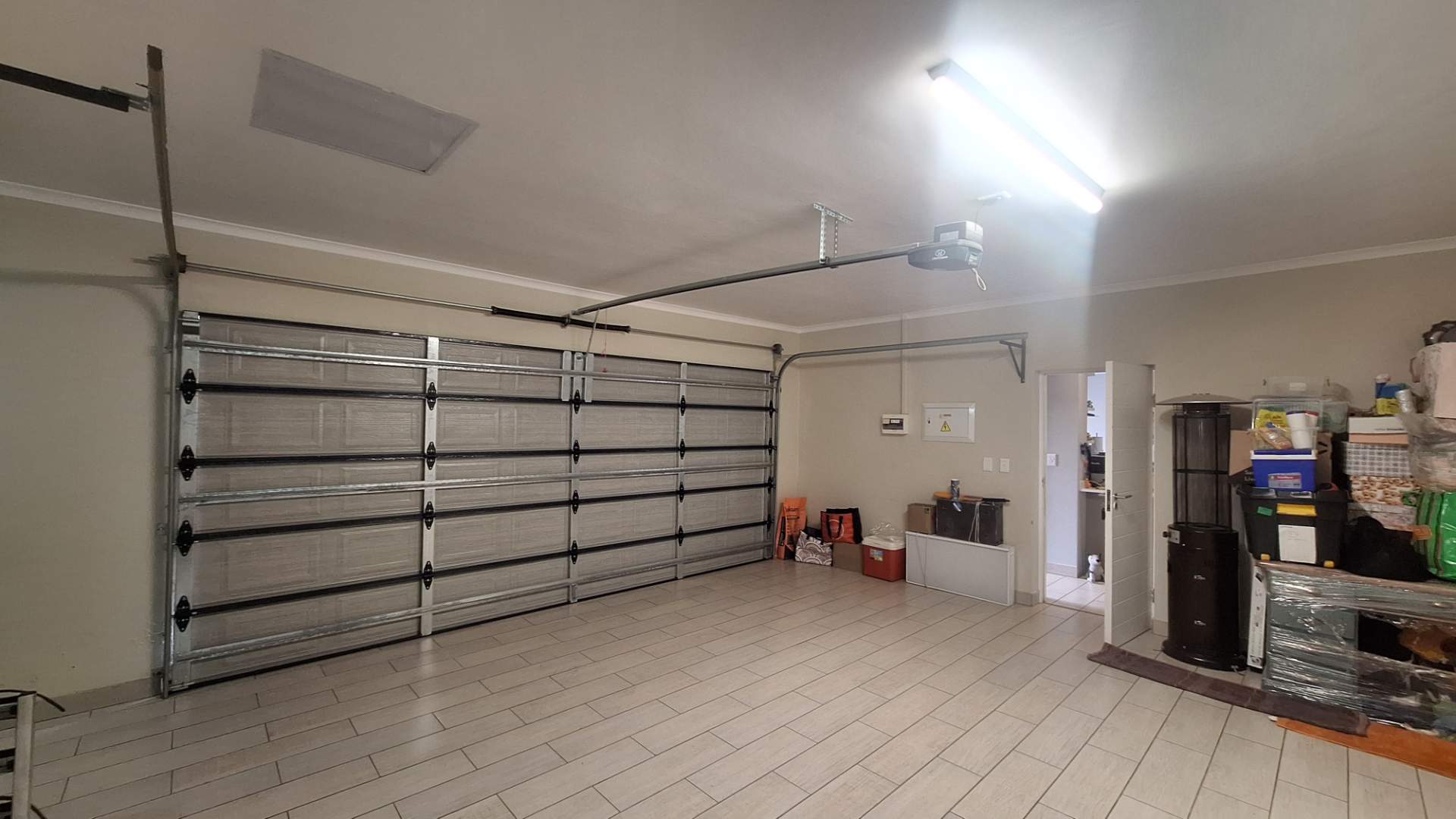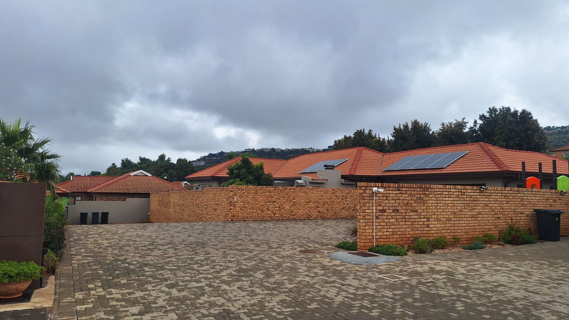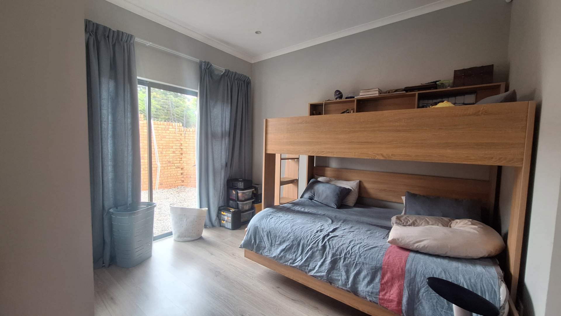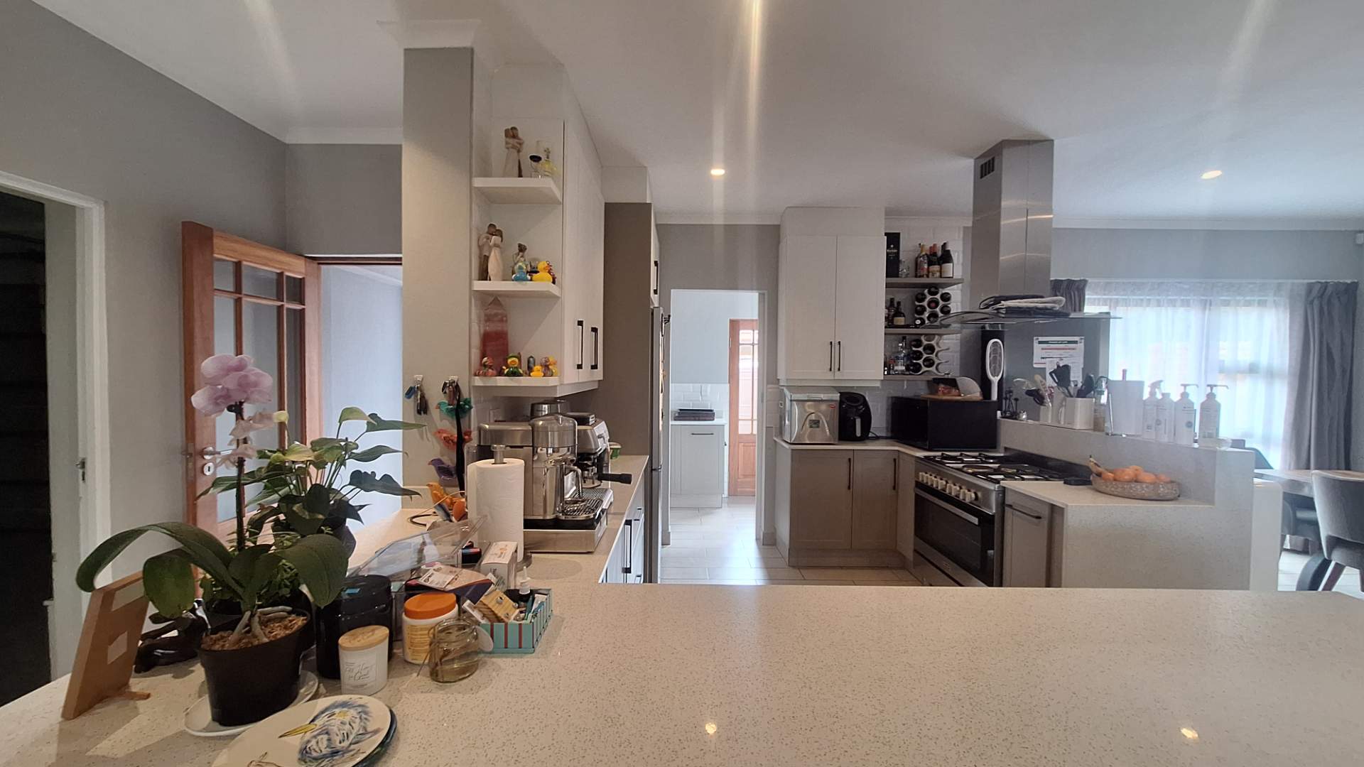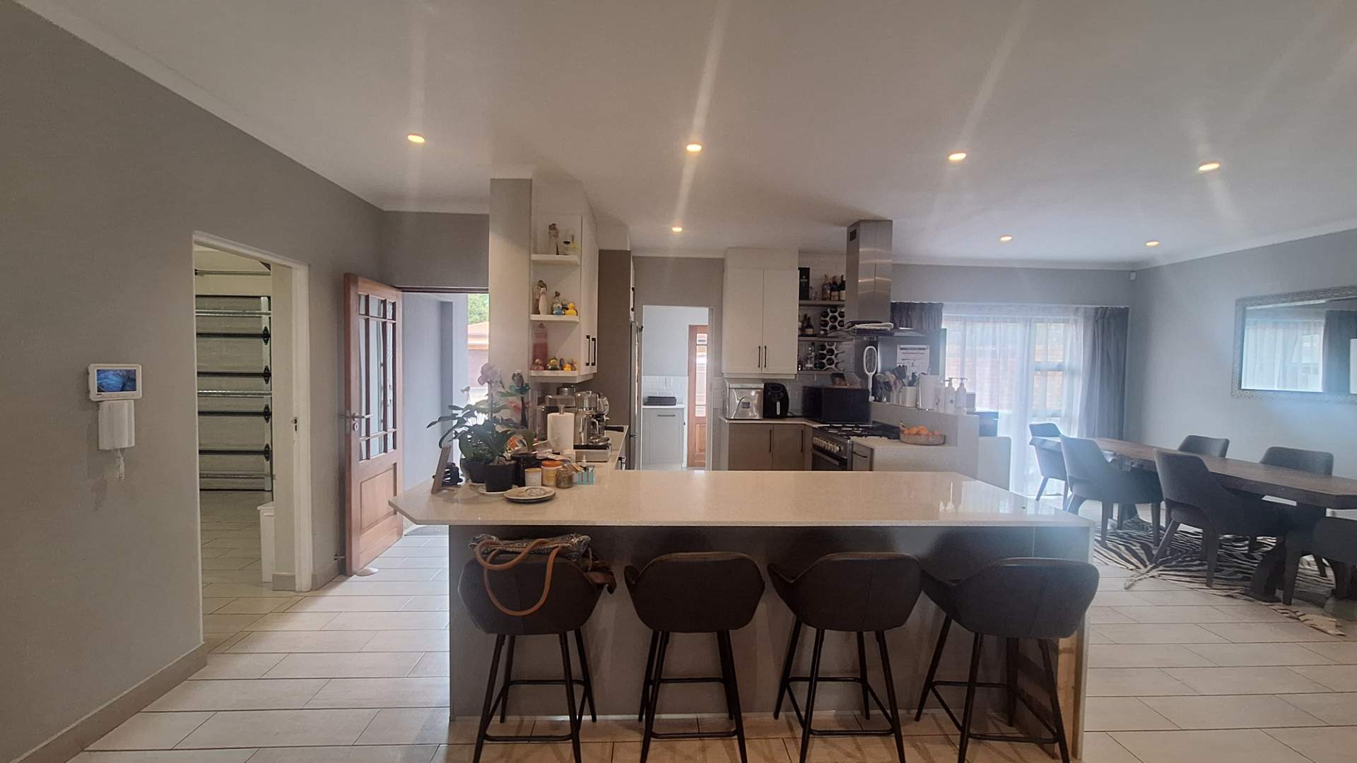 The exterior offers a double automated garage with a laundry area that accommodates two appliances, an undercover patio with a built-in braai, and a spacious garden. The property is fibre ready and includes staff quarters with an en-suite bathroom. There is extra parking in the driveway. The property is access controlled, with an automated gate, electric fencing, and cameras at the entrance. Solar panels provide backup solar power.