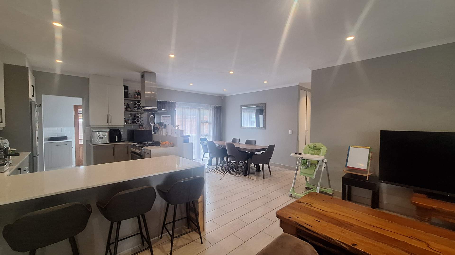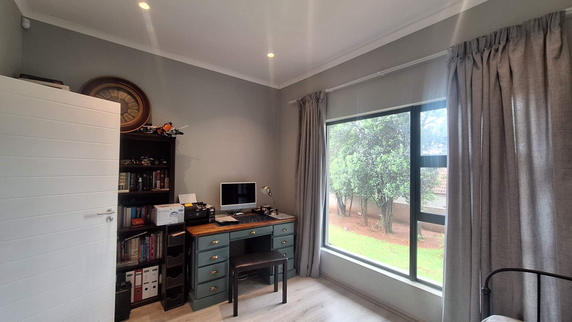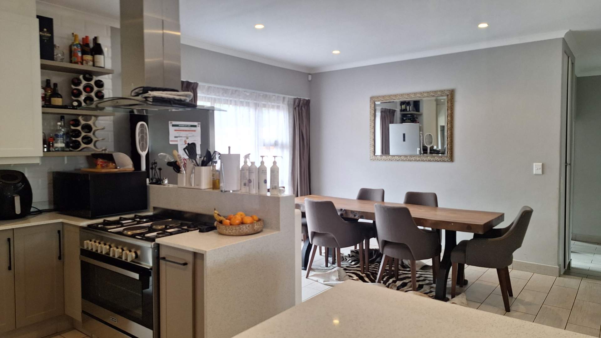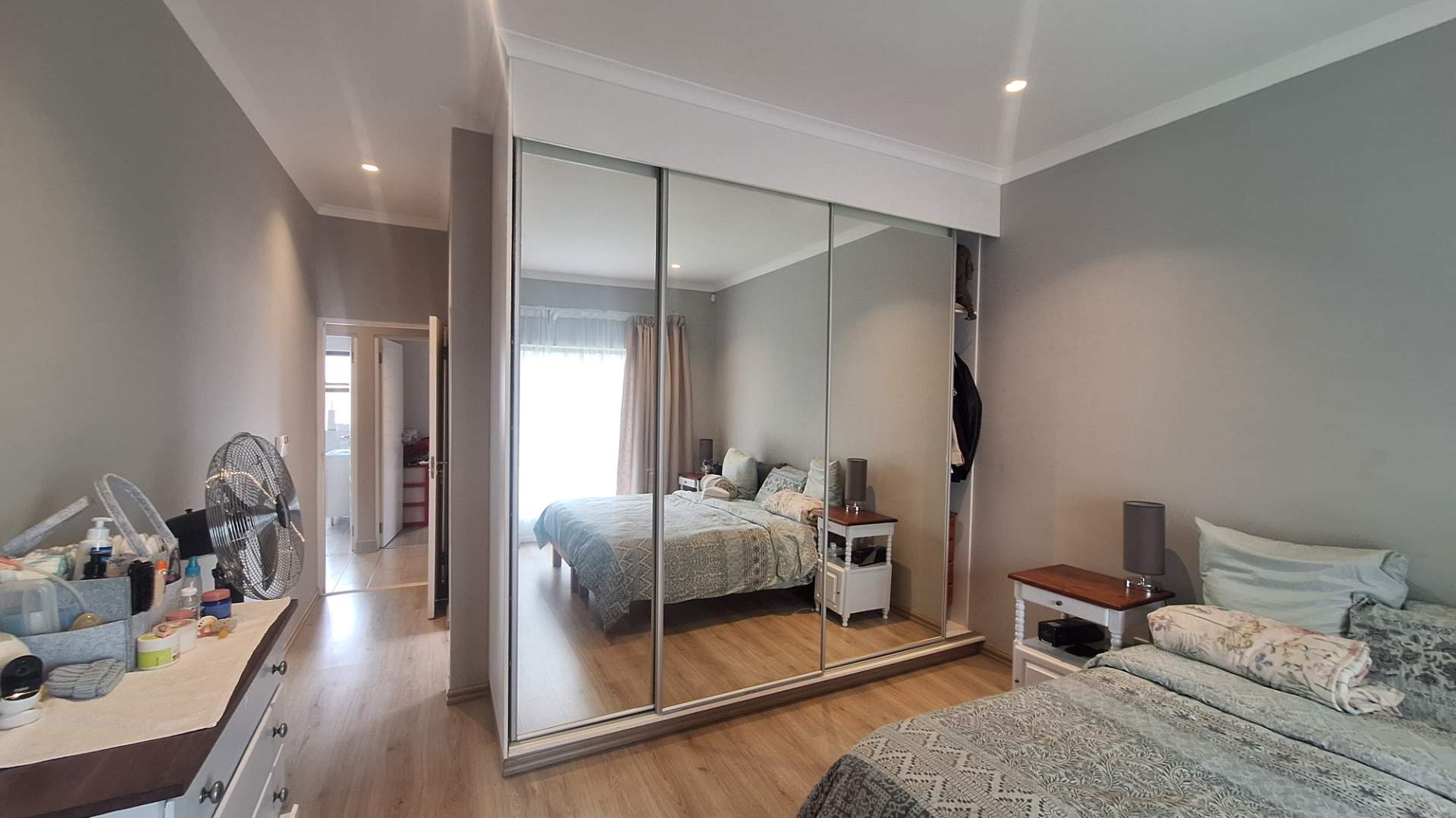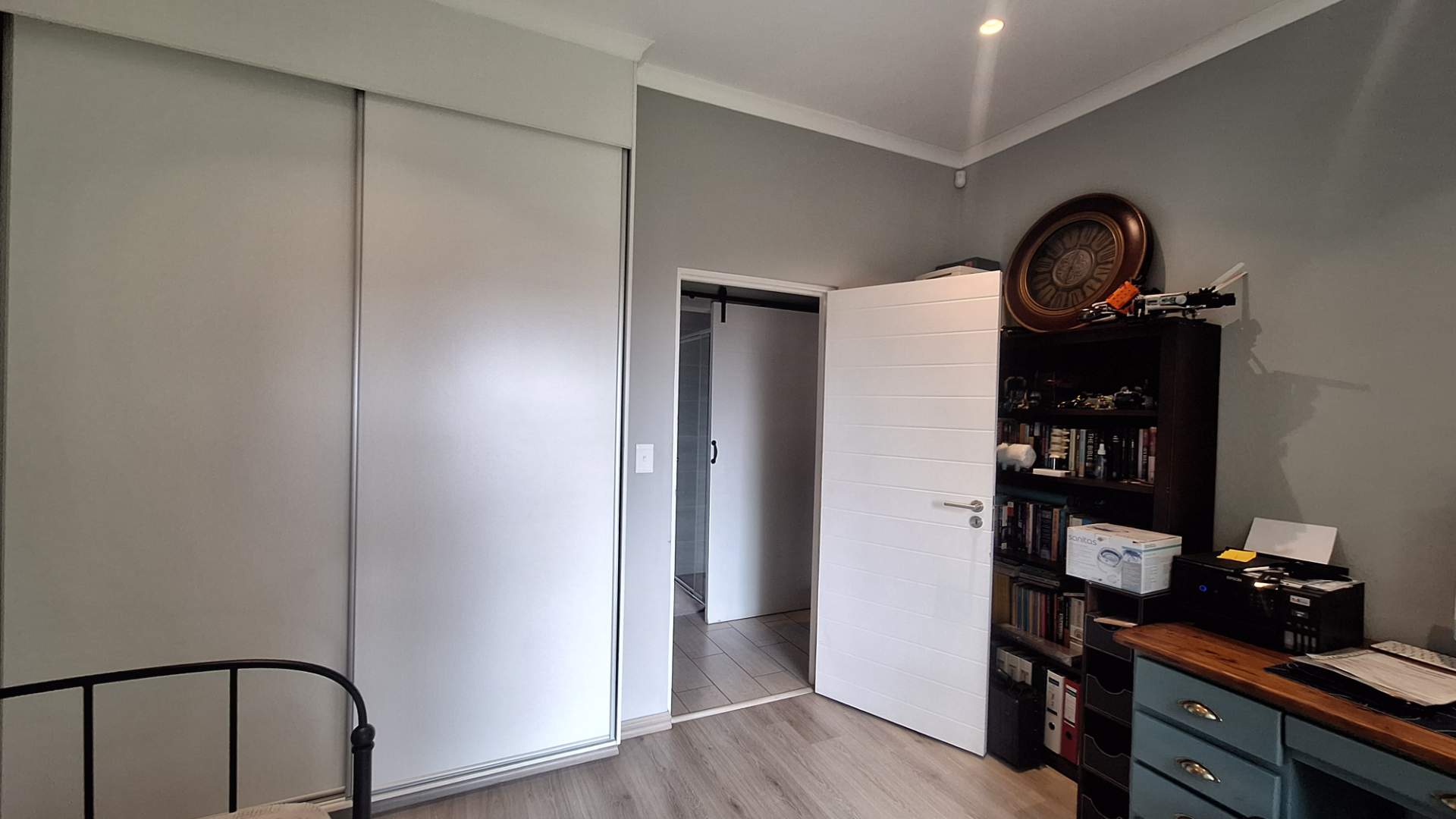 The exterior offers a double automated garage with a laundry area that accommodates two appliances, an undercover patio with a built-in braai, and a spacious garden. The property is fibre ready and includes staff quarters with an en-suite bathroom. There is extra parking in the driveway. The property is access controlled, with an automated gate, electric fencing, and cameras at the entrance. Solar panels provide backup solar power.