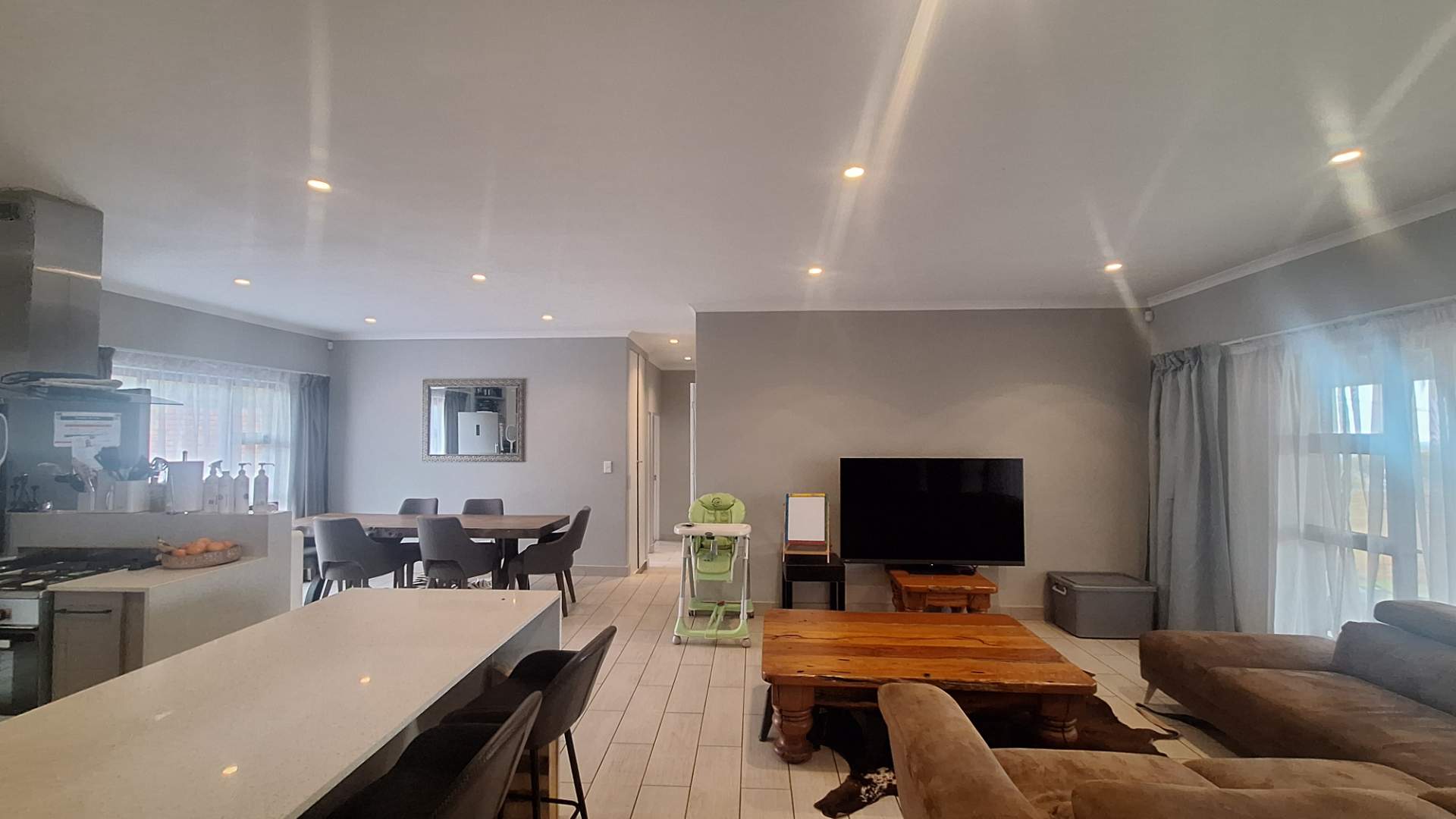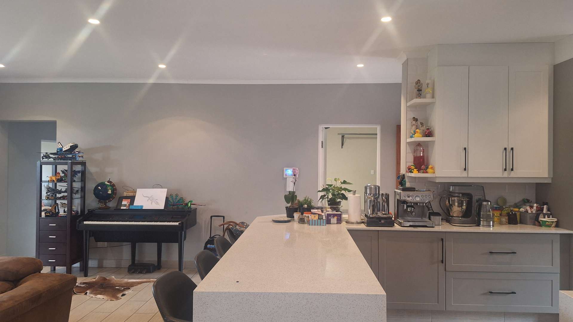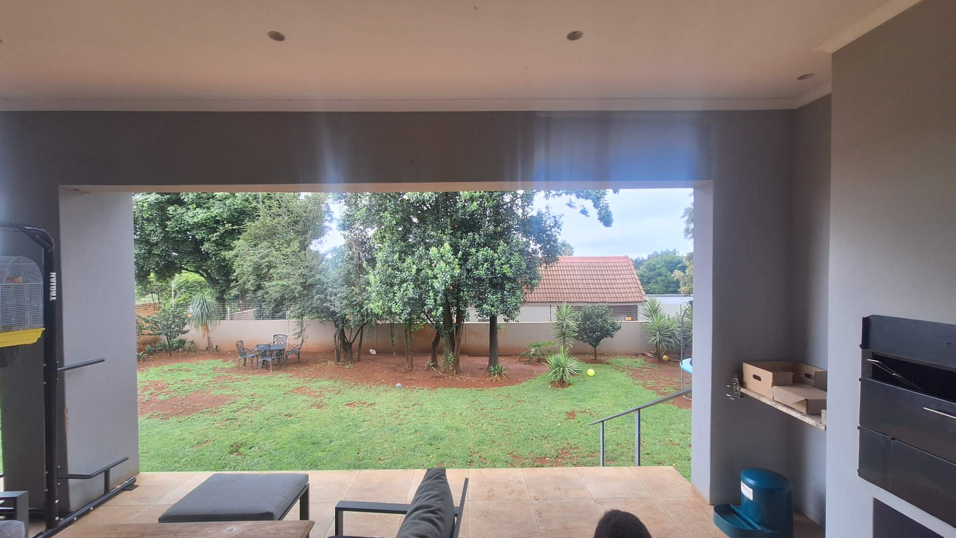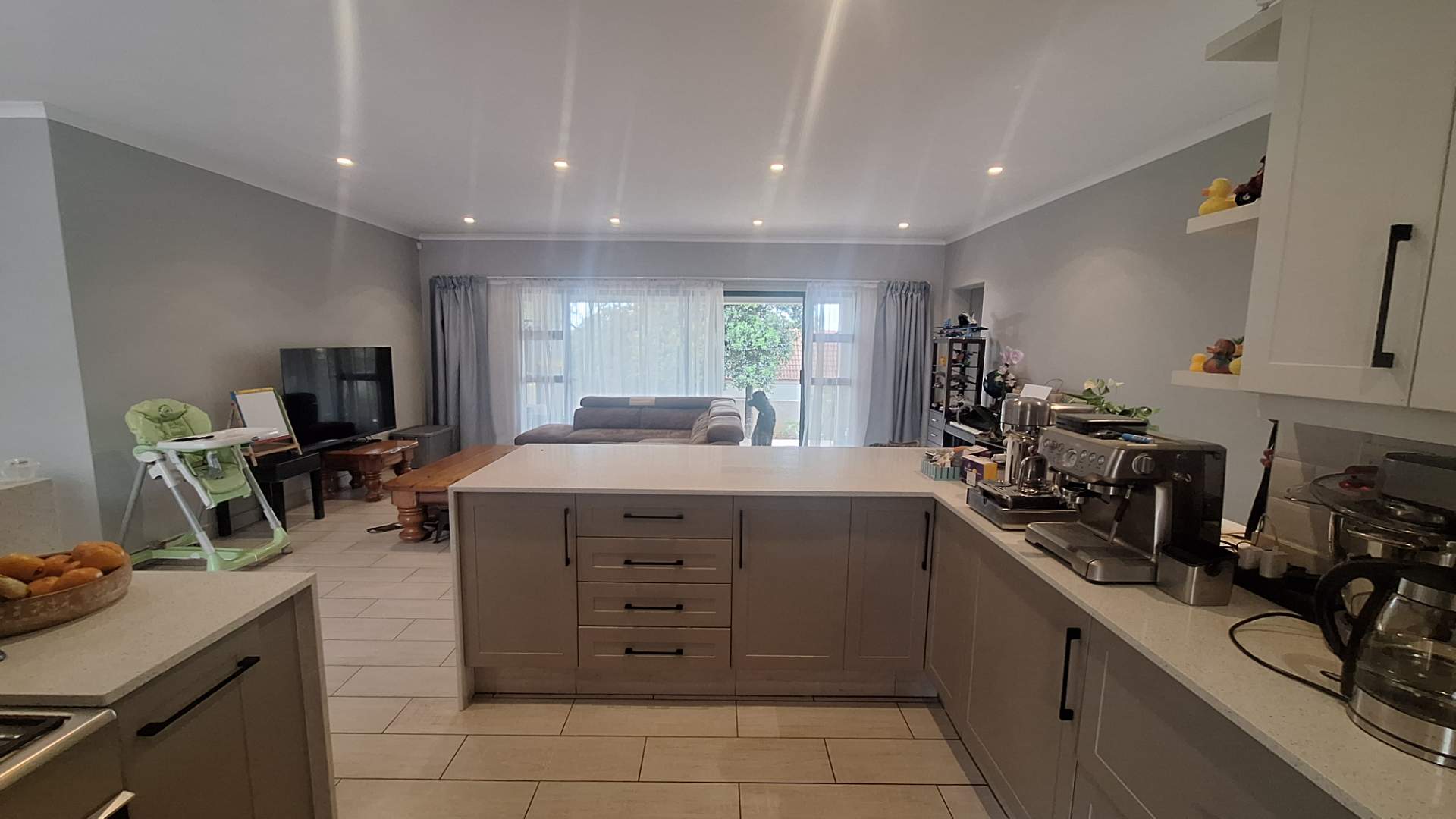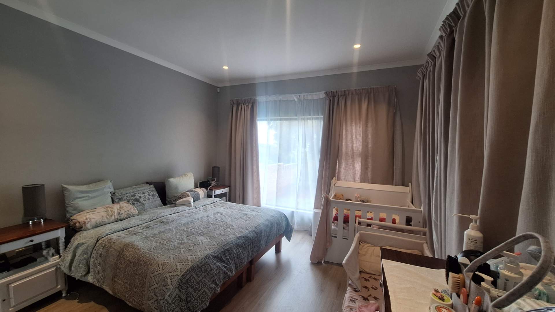 The exterior offers a double automated garage with a laundry area that accommodates two appliances, an undercover patio with a built-in braai, and a spacious garden. The property is fibre ready and includes staff quarters with an en-suite bathroom. There is extra parking in the driveway. The property is access controlled, with an automated gate, electric fencing, and cameras at the entrance. Solar panels provide backup solar power.