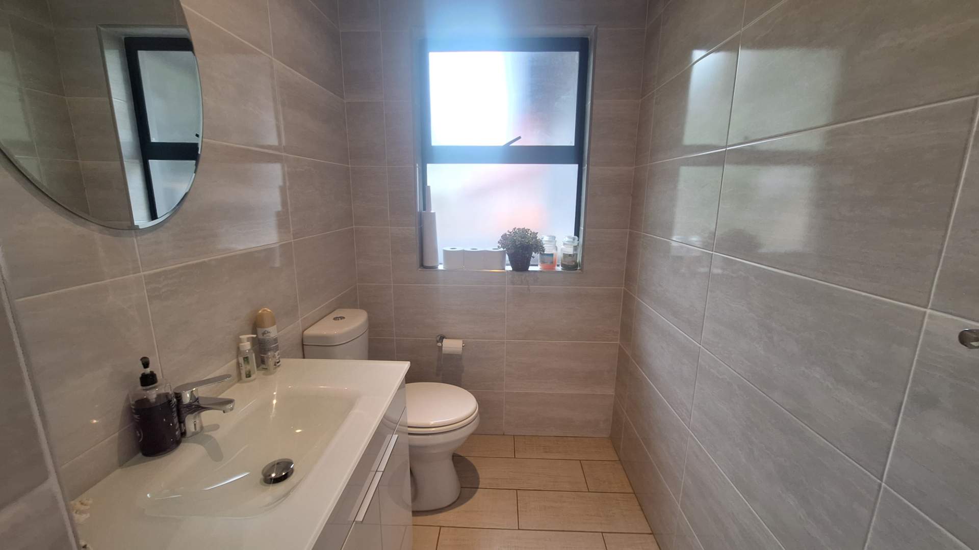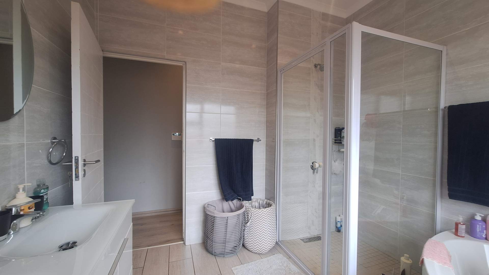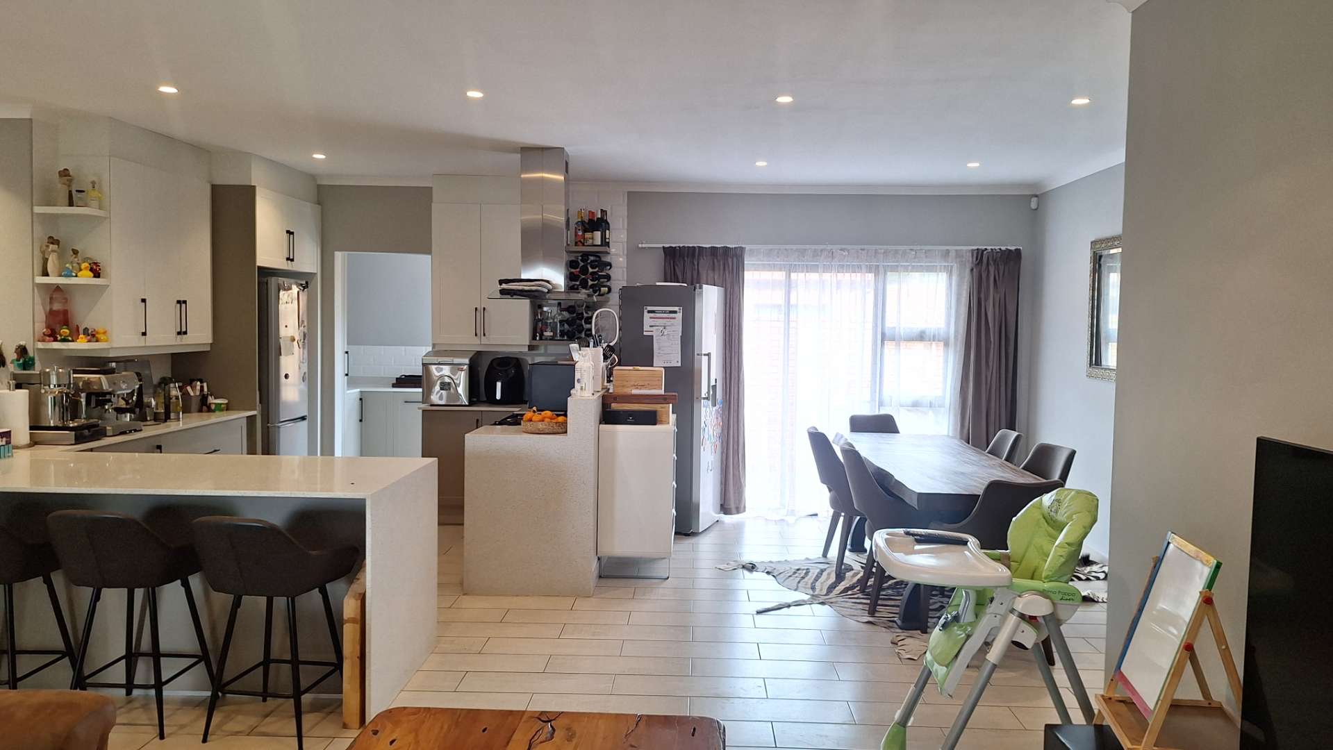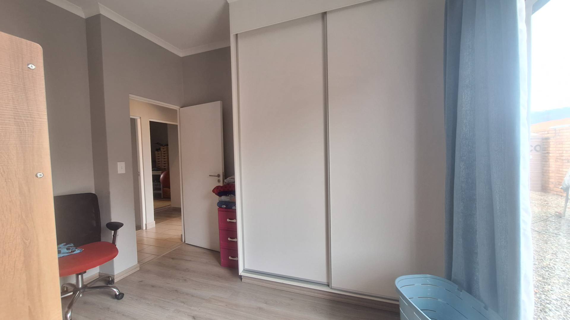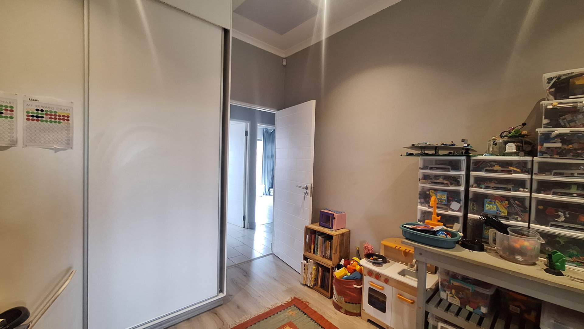 The exterior offers a double automated garage with a laundry area that accommodates two appliances, an undercover patio with a built-in braai, and a spacious garden. The property is fibre ready and includes staff quarters with an en-suite bathroom. There is extra parking in the driveway. The property is access controlled, with an automated gate, electric fencing, and cameras at the entrance. Solar panels provide backup solar power.
