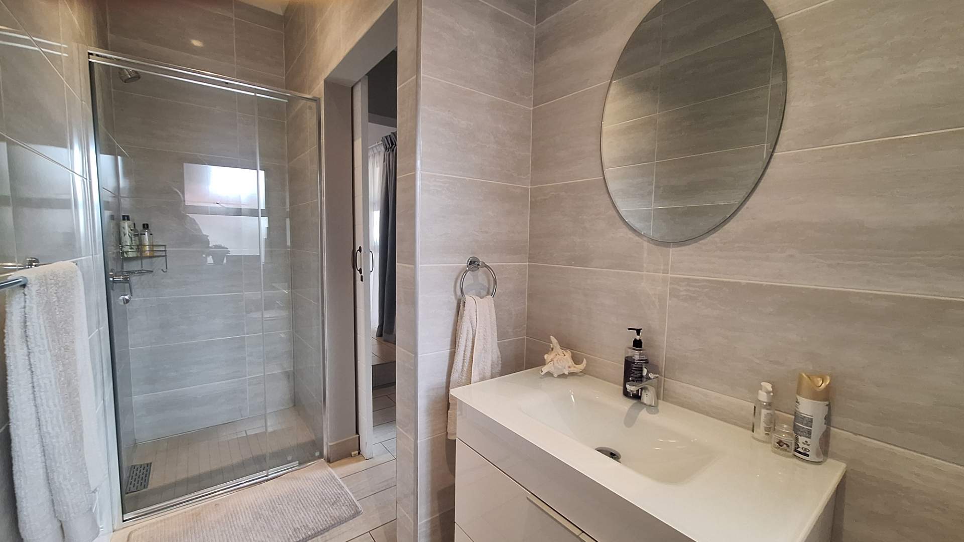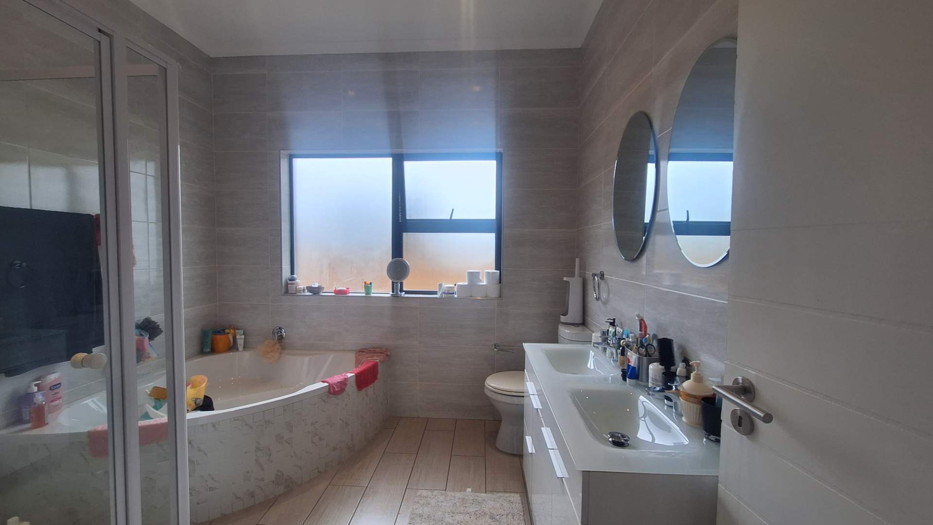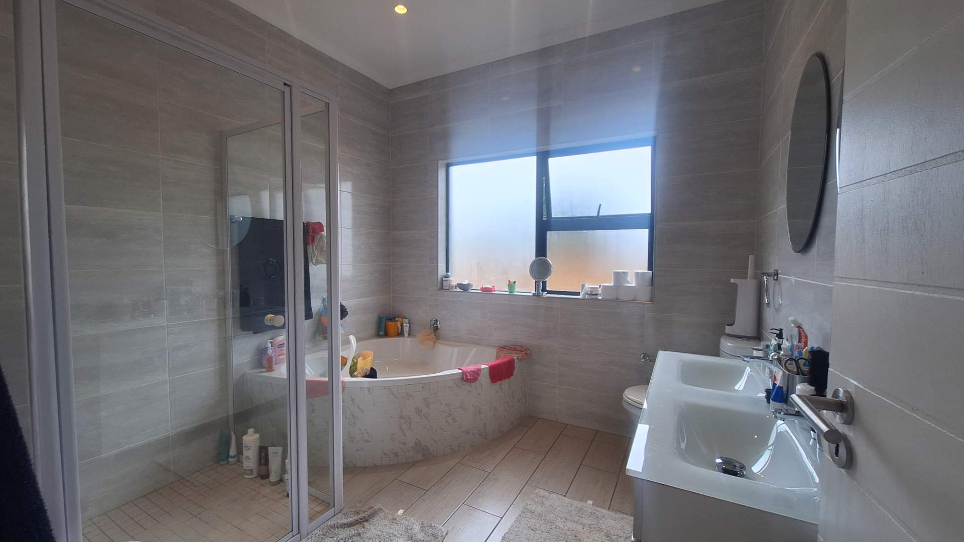 The interior features a spacious and bright living and dining area, a modern kitchen with ample cupboard space, a five-plate gas hob, an electric oven, and space for a double-door fridge. The scullery has space for one undercounter appliance. The large main bedroom includes sliding doors leading to the patio and an en-suite bathroom with a bath, shower, and his-and-hers basins. The second and third bedrooms both have ample built-in cupboards with sliding doors. The fourth bedroom includes built-in cupboards with sliding doors, and an en-suite bathroom. The first bathroom has a shower and serves as the en-suite to the guest bedroom. The second bathroom includes a corner bath and shower, and the third bathroom, en-suite to the main bedroom, features a bath, shower, and his-and-hers basins.