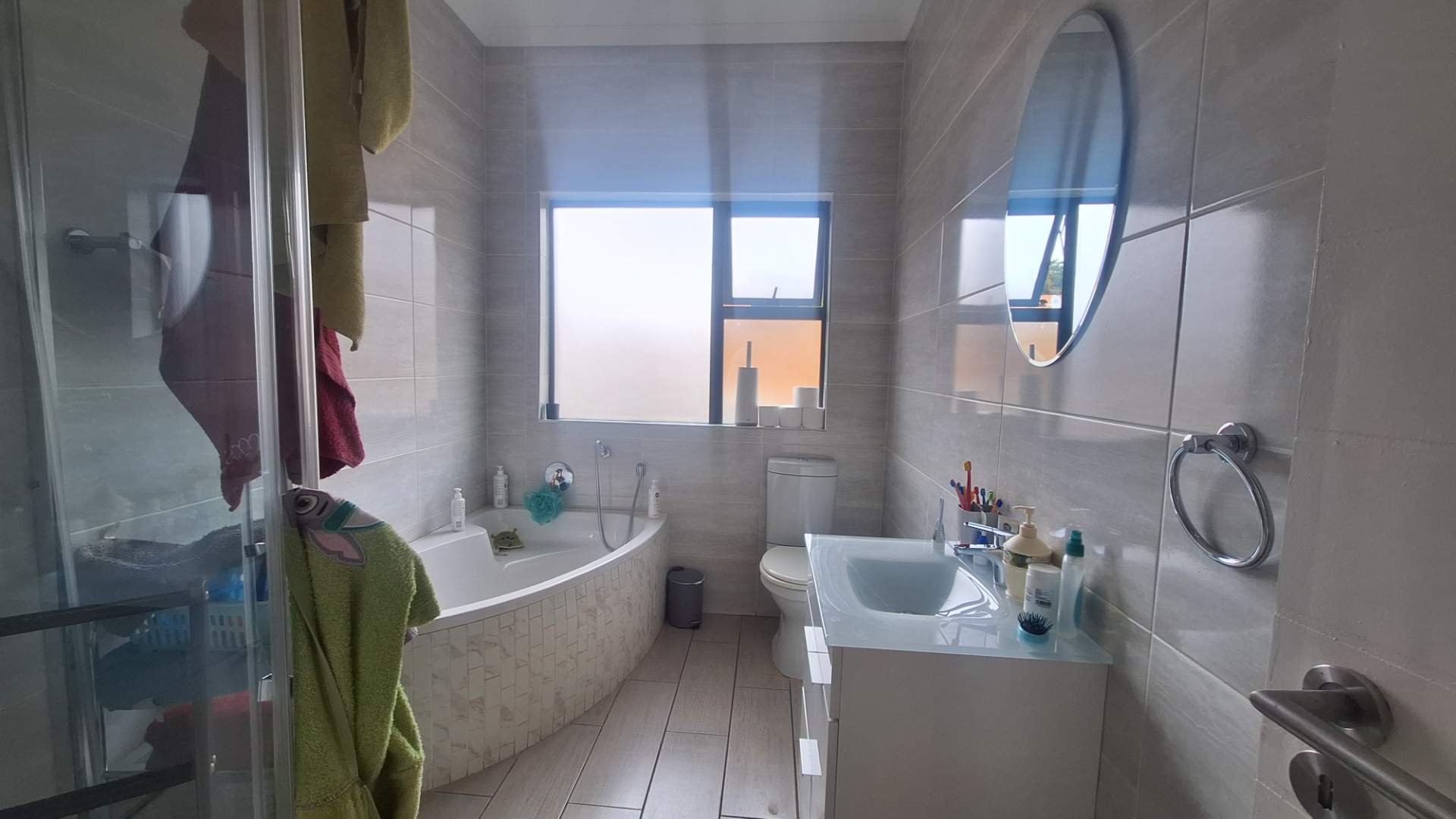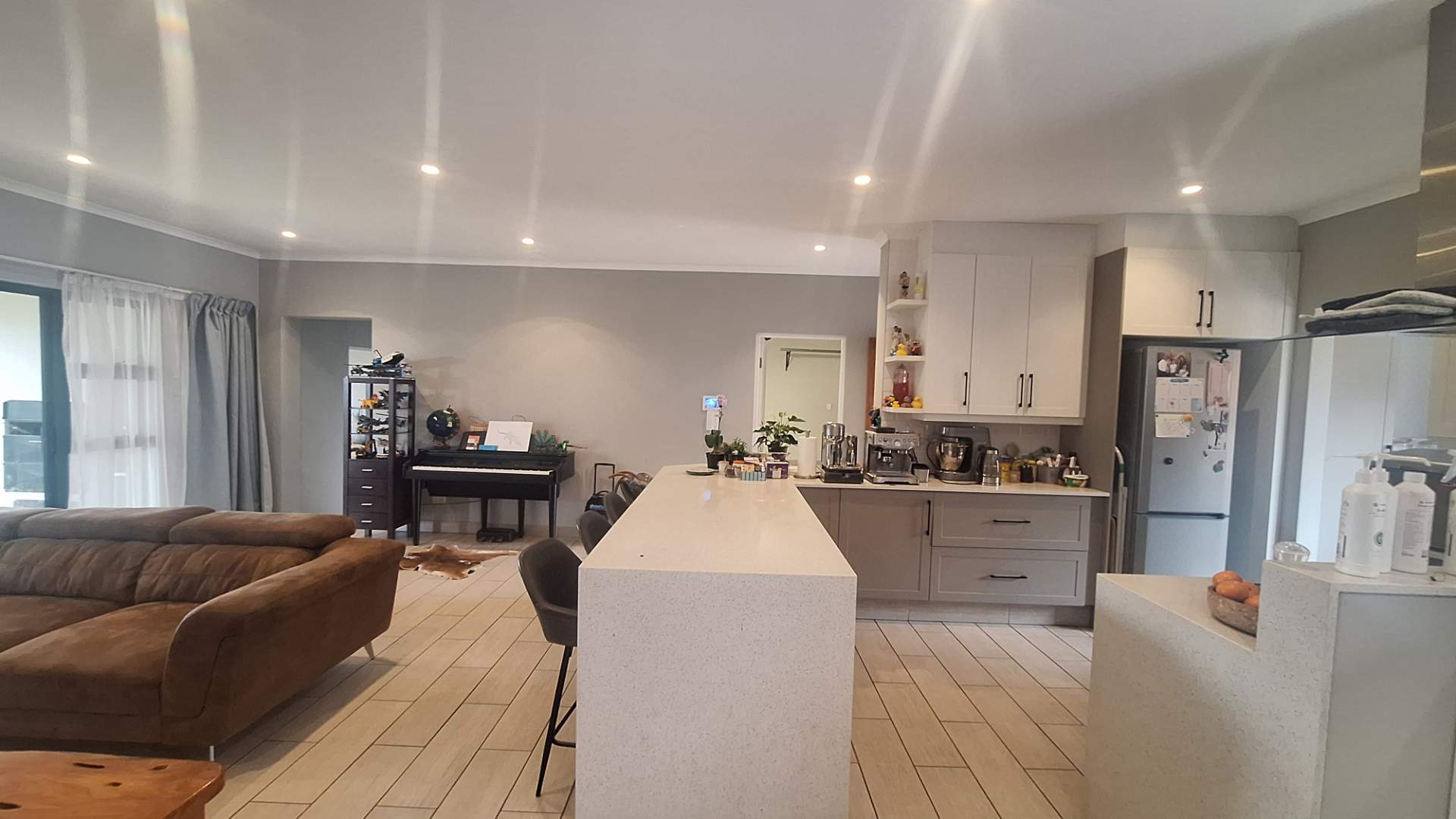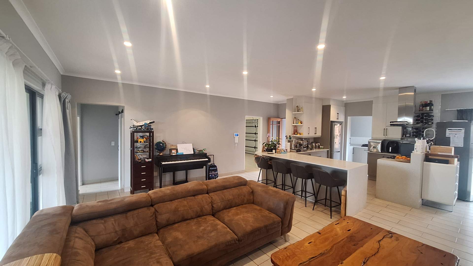 The interior features a spacious and bright living and dining area, a modern kitchen with ample cupboard space, a five-plate gas hob, an electric oven, and space for a double-door fridge. The scullery has space for one undercounter appliance. The large main bedroom includes sliding doors leading to the patio and an en-suite bathroom with a bath, shower, and his-and-hers basins. The second and third bedrooms both have ample built-in cupboards with sliding doors. The fourth bedroom includes built-in cupboards with sliding doors, and an en-suite bathroom. The first bathroom has a shower and serves as the en-suite to the guest bedroom. The second bathroom includes a corner bath and shower, and the third bathroom, en-suite to the main bedroom, features a bath, shower, and his-and-hers basins.